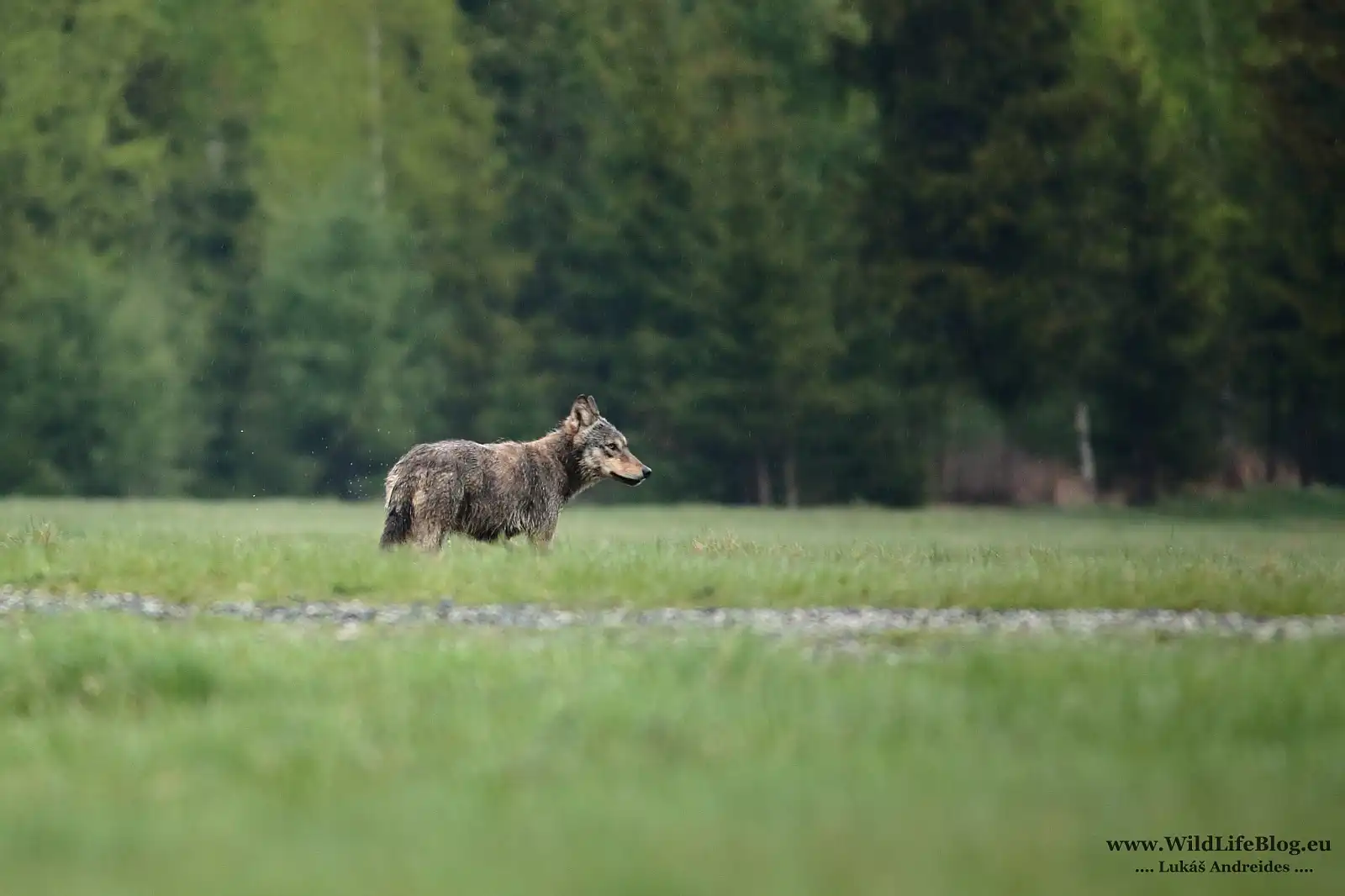 Das Erlebnis behandelt von einem fünfköpfigen Rudel. Die Wettervorhersage war schlimm – drei Tage Regen, zu dem sich noch Wind und Nebel gesellen sollten. Ein Grund für uns Menschen, vor dem Fernseher auf der Couch zu hocken. Doch für die Raubtiere gibt es kein besseres Wetter! Im Wald kommt neues Leben auf – Rehkitze, Hirschkälber und Frischlinge – die alle sind wie ein Magnet für Wölfe. Deswegen habe ich mich entschieden, die folgenden drei harschen und verregneten Tage den Wölfen bei einem ihrer Wildwechsel aufzulauern. Zwei Morgen sind vergangen, ohne einen Anschein auf eine erfolgreiche Begegnung zu bekommen. Das Einzige, was ich einfahren konnte, waren Frostfinger und durchnässte Kleidung. Die Morgentemperaturen hielten sich knapp über Null. Beim Fotografieren verwende ich nur Tarnnetze, denn mit dem Fotostand konnte ich mich nie anfreunden, weswegen ihn jetzt meine Kinder als Spielzeug benutzen. Dennoch, aller guten Dinge sind drei. Am dritten Morgen bin ich noch während der Dämmerung an einen Wiesenrand gelangt. Der Tag bricht an, noch sehe ich kein Wild – ein gutes Zeichen für die Anwesenheit eines Wolfs. Ich sitze auf meinem Rucksack und beobachte die Umgebung. Da läuft ein schöner junger Keiler (Wildschwein) vorbei. Ich sehe ihn mir durch den Sucher an – seine Rückenborsten sind aufgestachelt und der Bürzel (Schwanz) ist wie eine Antenne aufgestellt. Ein kleines Grinsen schwebt in mir – das Wölflein muss in der Nähe sein. Und tatsächlich, nach 10 Minuten taucht ein junger Wolf auf der Wiese auf und kommt bis auf 80 Meter Entfernung. Ich schaffe noch einige Fotos zu machen, bis der Wolf in der Dickung verschwindet.