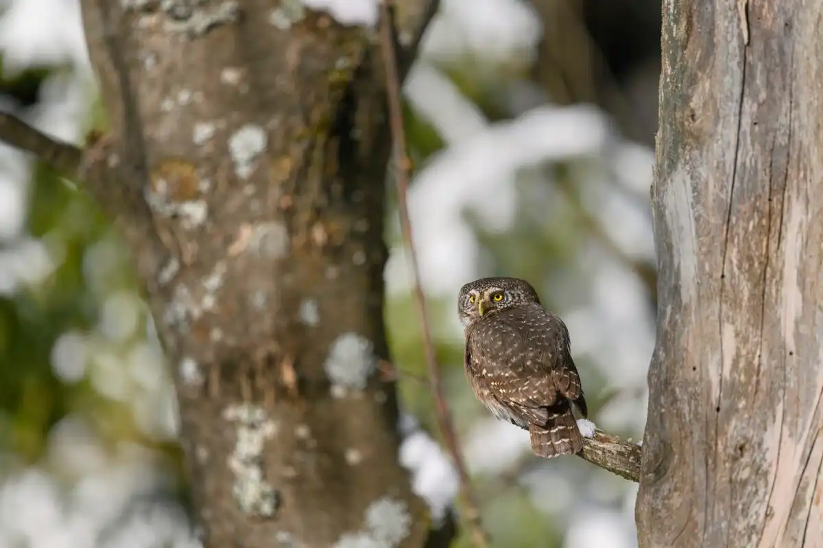 Okolo šiestej prichádzam na danú lokalitu; svetlo je aké je, no Obyčka mala asi náročnú noc; už je ticho – nehúka. Viem, že tu je, tak jej zahúkam ja. „Húúú, húúú…“ načúvam…nič. Ticho! Po 5 minútach som sa je ozval opäť, a čože? Zrazu mi čosi preletelo nad hlavou. S rozvahou a kľudom Angličana sa pomaličky otáčam, obzerám okolie. Trvalo mi hodnú chvíľu, kým som tu krásnu sovu zbadal v spleti konárov sedieť pár metrov odo mňa na starom odumretom strome. Sova otočila ku mne hlavu a uprela na mňa pohľad. „Zbadala ma!“ pomyslel som si. „Čo urobí? Odletí?“ Pozerá na mňa ako keby ešte nikdy nevidela človeka. Jej krásne sivobiele perie v odrazoch ranného slnka bolo veľmi krásne. Myslel som si, že sa maskuje krajinou, no keď krajina občas ustúpila pred jej zjavením, rýchlo stláčam spúšť fotoaparátu a robím si pre mňa vzácne zábery. Sova len pootočila hlavou a ozvala sa kontaktným hlasom. Keď po chvíľke krídlami pretínala prvé ranné lúče slnka a sadla si na ďalší strom, robím ešte pár záberov a užívam si chvíle len ja a sova obyčajná.