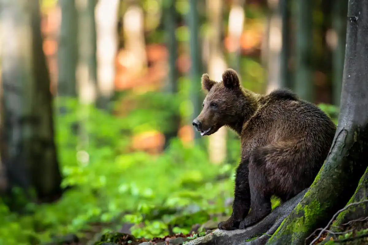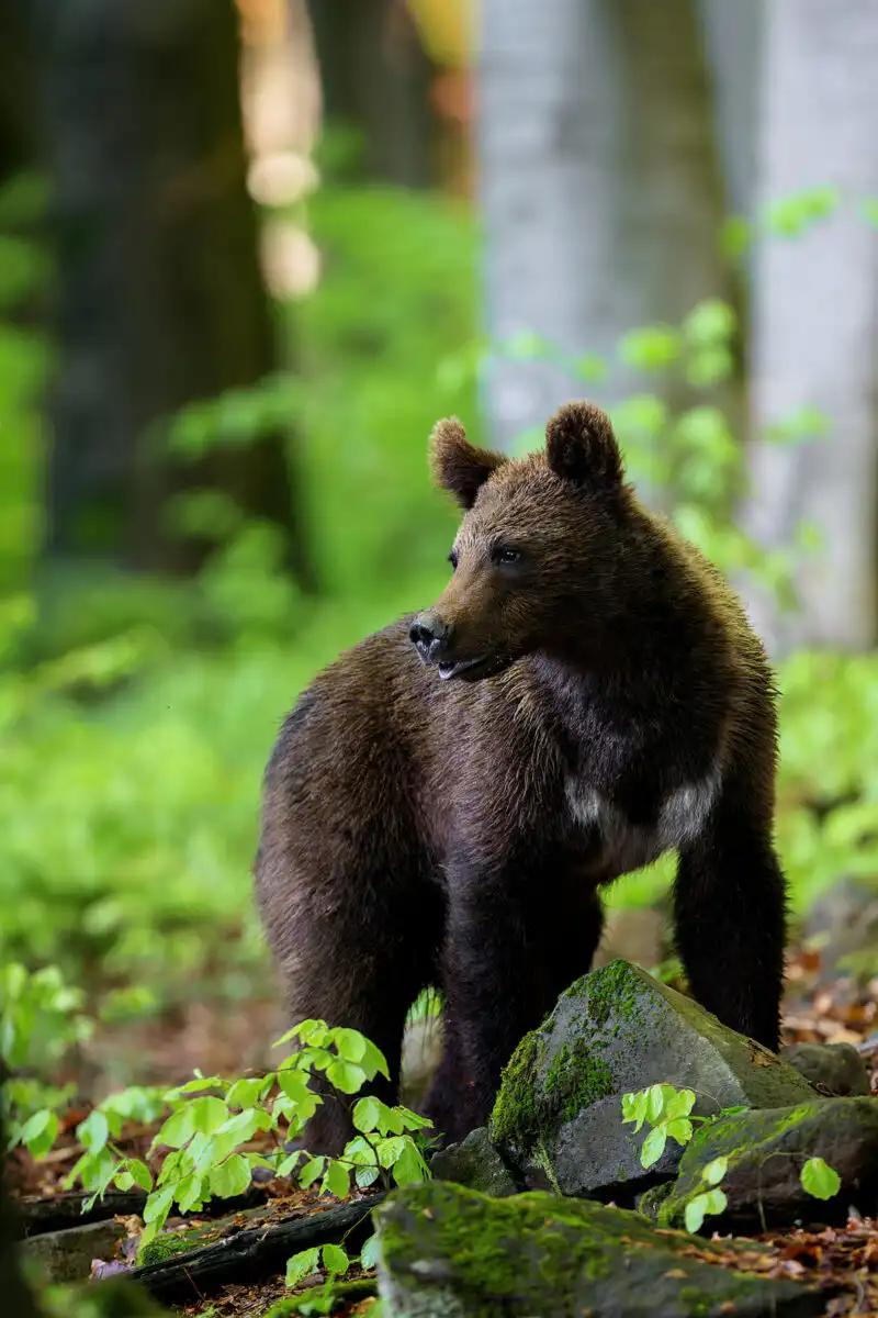 Asi po hodine čakania všetko stíchlo a my z ľavej strany registrujeme pohyb v húštine. Naše zmysly sú zrazu zamerané iba jediným smerom. Zakrátko z húštiny vychádza medveď. Na pohľad malý medvedík, odhadom mohol mať okolo 50-60kg. Prechádza z ľavej strany popred nás. Pôsobí tak roztomilo, že by si ho človek chcel zobrať so sebou ako domáce zvieratko. Pri pohľade naň nám ani nenapadlo, že o pár rokov z neho môže byť obávaná a do určitej miery aj nebezpečná šelma. Asi 20m pred nami sa otáča naším smerom. Vetrí… Vietor nám praje, a tak sa necíti v ohrození. Na chvíľku si sadá pod statný buk. Chvíľku sa čistí, čím nám dopraje možnosť na pár ďalších záberov. Na tele má krásny, svetlý golier, ktorý akoby sa leskol, keď naň zasvietia lúče večerného slnka. Skrátka krásne a roztomilé zvieratko. Náhle sa zodvihne, ešte sa trošku poobzerá po okolí a pomalým krokom sa stráca v diaľke, v hustom poraste mladých bukov.