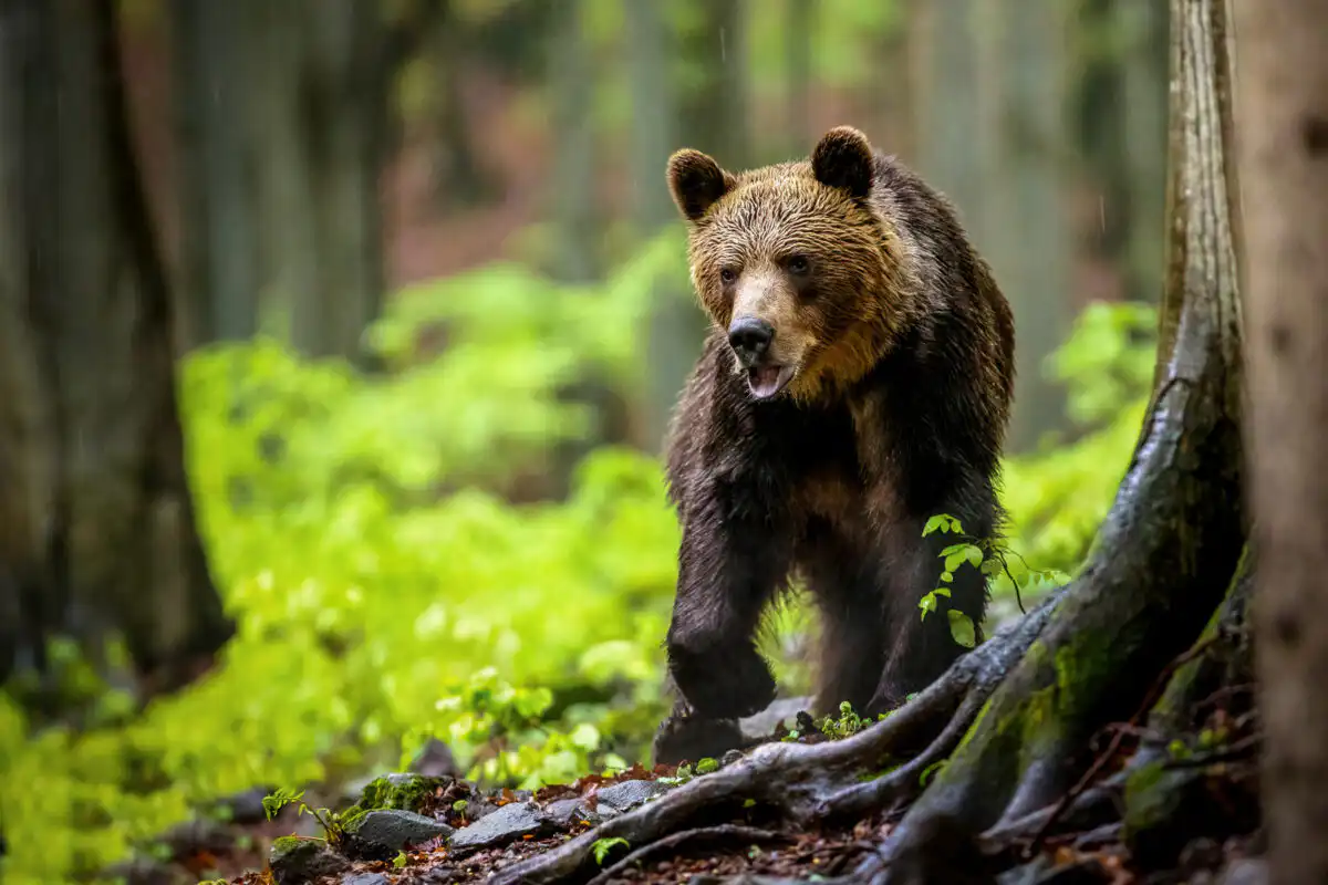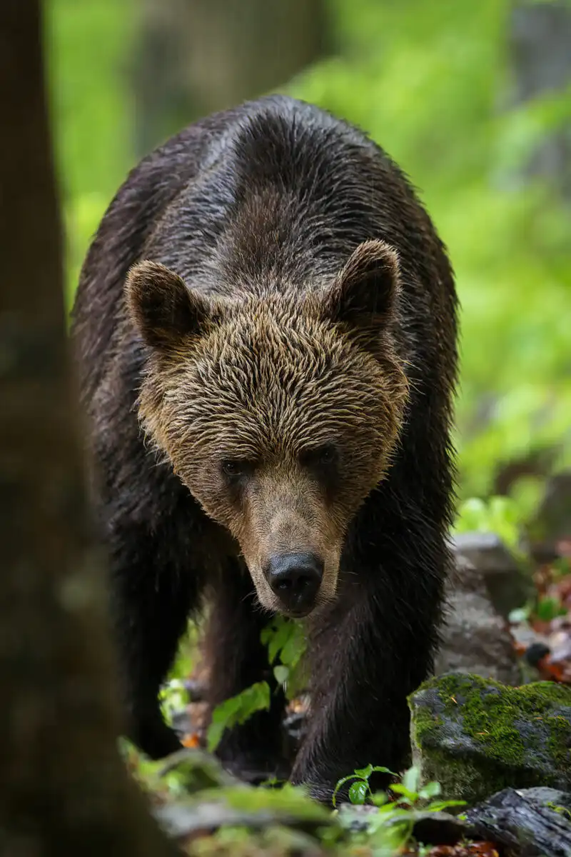 Dážď ešte viac silnie a ja sa pomaly začínam chystať na odchod. Ešte sa nakrátko obzerám po okolí. Z rovnakej strany ako večer, z húštia vychádza silueta. Je pochmúrne, hustý dážď, a preto siluetu nedokážem spoľahlivo identifikovať. Prichádza bližšie. Je to medveď. Tentokrát už nie len taký malý medvedík, môže mať odhadom tak 150-200kg. Z ľavej strany prechádza asi 10m popod mňa a miernym oblúkom prechádza vpred. Je pomerne silný dážď a určite aj to výrazne dopomohlo k tomu, aby nás nezacítil. Kráča kľudne, majestátne. Pomaly sa od nás vzďaľuje. Asi po 30m zastavuje. Otáča sa. Pozerá naším smerom. Niečo sa mu nezdá a vracia sa k nám. Jeho pohľad vzbudzuje rešpekt. Už to nie je ten roztomilý medvedík zo včera. Už je to ozajstný a nefalšovaný pohľad našej najväčšej šelmy a pána lesa. Atmosféru tejto chvíle dotvára pochmúrne počasie, hustý dážď a mierne prítmie lesa. Medveď svojimi mohutnými labami ticho našľapuje a čoraz viac sa blíži k nám. Kvapiek dažďa stekajúcich po jeho hlave má už zrejme dosť. Asi 15m od nás sa obzerá, venuje nám krátky, no nervózny pohľad a v jednej chvíli rýchlo metá svojou mohutnou hlavou do strán. Kvapky z jeho srsti striekajú po okolí. Akoby v tom momente na okamih zastal čas. Našťastie som bol pripravený a stláčam spúšť. Celé to trvalo hádam dve sekundy, no za ten čas som stihol spraviť sériovo pár záberov. V duchu sa modlím, aby aspoň jedna fotografia bola ako tak ostrá, keďže kvôli nedostatku svetla som mal nastavený dosť pomalý čas. Spomedzi 18tich fotiek v sérii sa jedna podarila. Len jedna, ale o to parádnejšia.