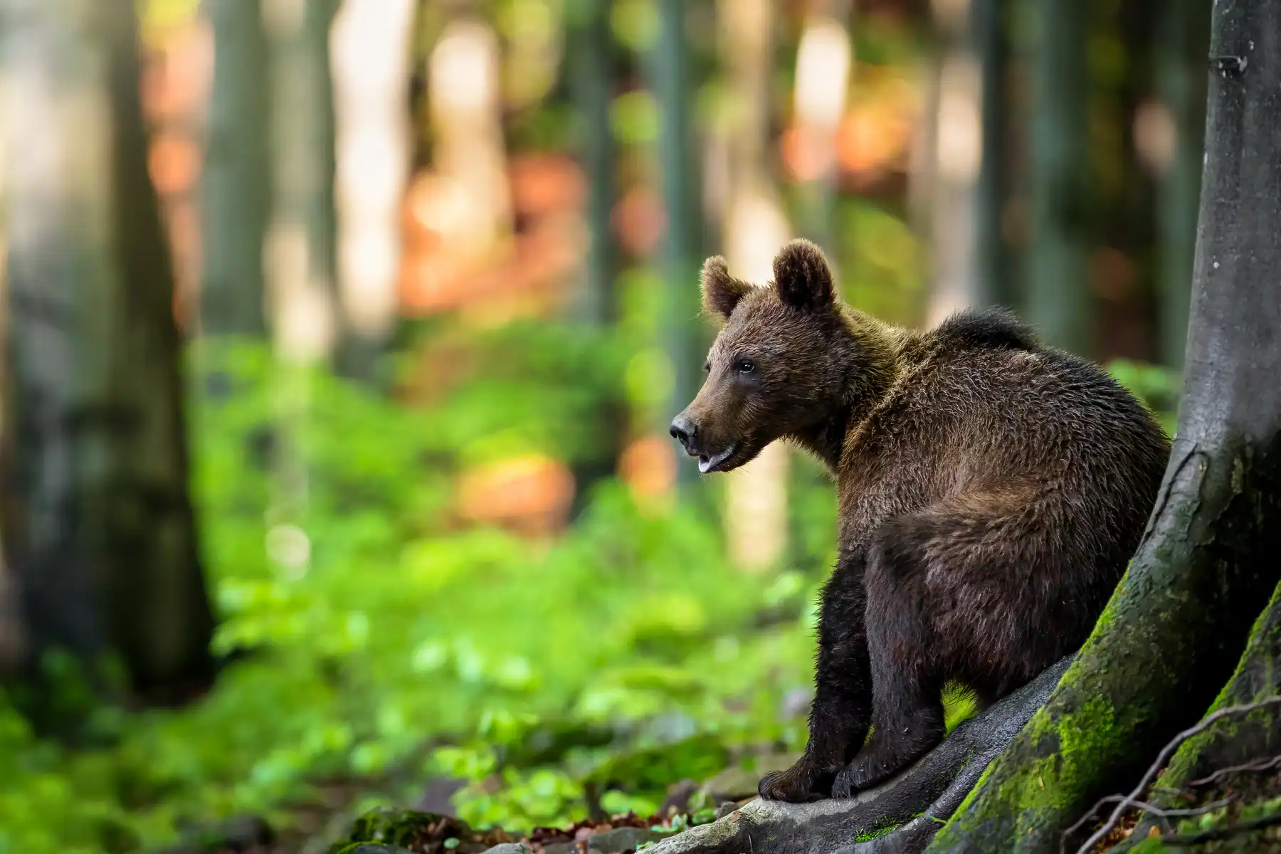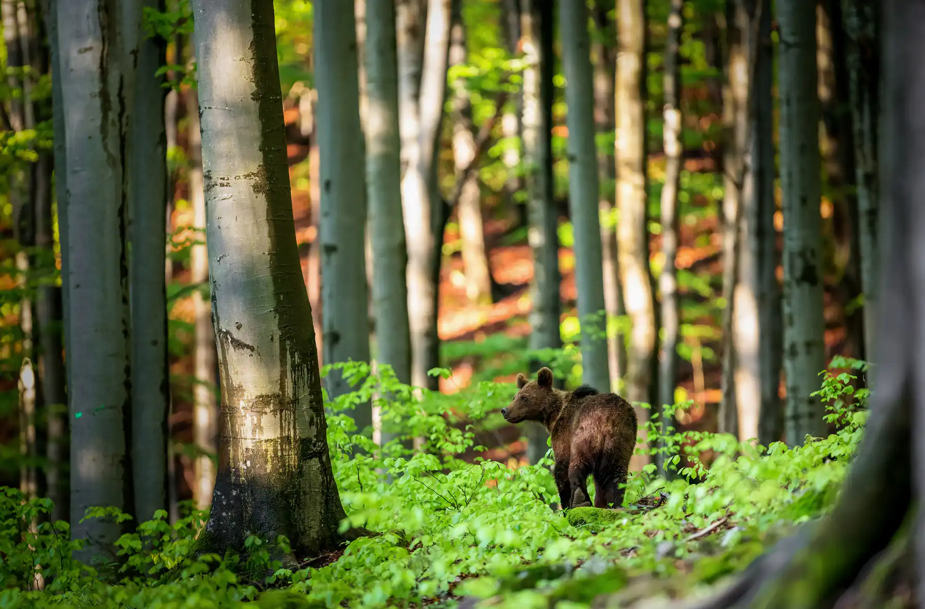 Asi po hodine čakania všetko stíchlo a my z ľavej strany registrujeme pohyb v húštine. Naše zmysly sú zrazu zamerané iba jediným smerom. Zakrátko z húštiny vychádza medveď. Na pohľad malý medvedík, odhadom mohol mať okolo 50-60kg. Prechádza z ľavej strany popred nás. Pôsobí tak roztomilo, že by si ho človek chcel zobrať so sebou ako domáce zvieratko. Pri pohľade naň nám ani nenapadlo, že o pár rokov z neho môže byť obávaná a do určitej miery aj nebezpečná šelma. Asi 20m pred nami sa otáča naším smerom. Vetrí… Vietor nám praje, a tak sa necíti v ohrození. Na chvíľku si sadá pod statný buk. Chvíľku sa čistí, čím nám dopraje možnosť na pár ďalších záberov. Na tele má krásny, svetlý golier, ktorý akoby sa leskol, keď naň zasvietia lúče večerného slnka. Skrátka krásne a roztomilé zvieratko. Náhle sa zodvihne, ešte sa trošku poobzerá po okolí a pomalým krokom sa stráca v diaľke, v hustom poraste mladých bukov.