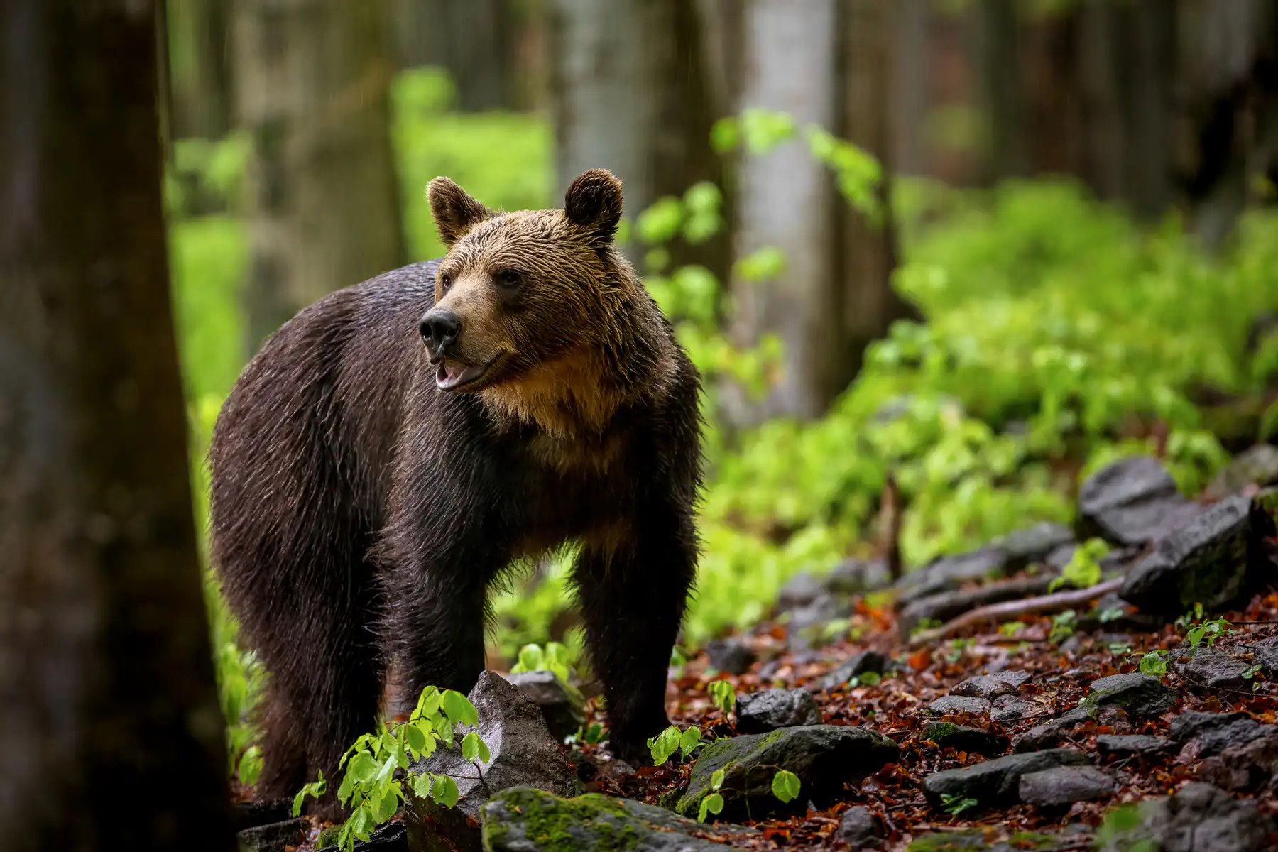 Dážď ešte viac silnie a ja sa pomaly začínam chystať na odchod. Ešte sa nakrátko obzerám po okolí. Z rovnakej strany ako večer, z húštia vychádza silueta. Je pochmúrne, hustý dážď, a preto siluetu nedokážem spoľahlivo identifikovať. Prichádza bližšie. Je to medveď. Tentokrát už nie len taký malý medvedík, môže mať odhadom tak 150-200kg. Z ľavej strany prechádza asi 10m popod mňa a miernym oblúkom prechádza vpred. Je pomerne silný dážď a určite aj to výrazne dopomohlo k tomu, aby nás nezacítil. Kráča kľudne, majestátne. Pomaly sa od nás vzďaľuje. Asi po 30m zastavuje. Otáča sa. Pozerá naším smerom. Niečo sa mu nezdá a vracia sa k nám. Jeho pohľad vzbudzuje rešpekt. Už to nie je ten roztomilý medvedík zo včera. Už je to ozajstný a nefalšovaný pohľad našej najväčšej šelmy a pána lesa. Atmosféru tejto chvíle dotvára pochmúrne počasie, hustý dážď a mierne prítmie lesa. Medveď svojimi mohutnými labami ticho našľapuje a čoraz viac sa blíži k nám. Kvapiek dažďa stekajúcich po jeho hlave má už zrejme dosť. Asi 15m od nás sa obzerá, venuje nám krátky, no nervózny pohľad a v jednej chvíli rýchlo metá svojou mohutnou hlavou do strán. Kvapky z jeho srsti striekajú po okolí. Akoby v tom momente na okamih zastal čas. Našťastie som bol pripravený a stláčam spúšť. Celé to trvalo hádam dve sekundy, no za ten čas som stihol spraviť sériovo pár záberov. V duchu sa modlím, aby aspoň jedna fotografia bola ako tak ostrá, keďže kvôli nedostatku svetla som mal nastavený dosť pomalý čas. Spomedzi 18tich fotiek v sérii sa jedna podarila. Len jedna, ale o to parádnejšia.