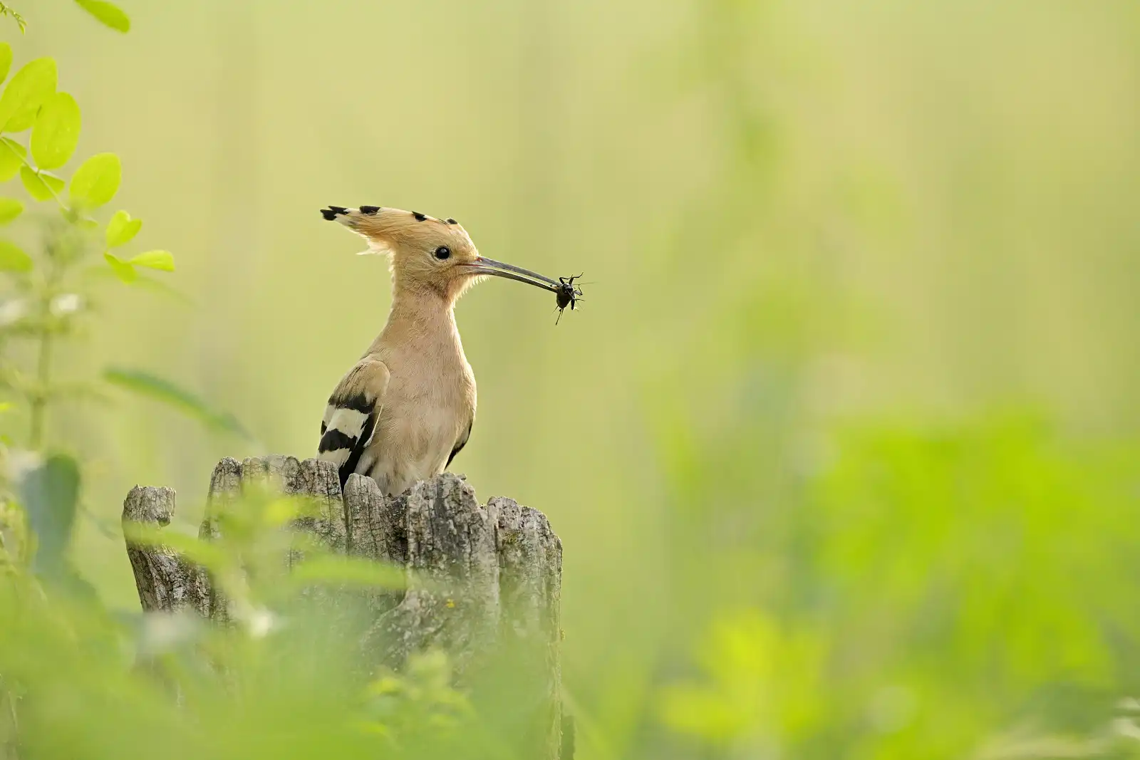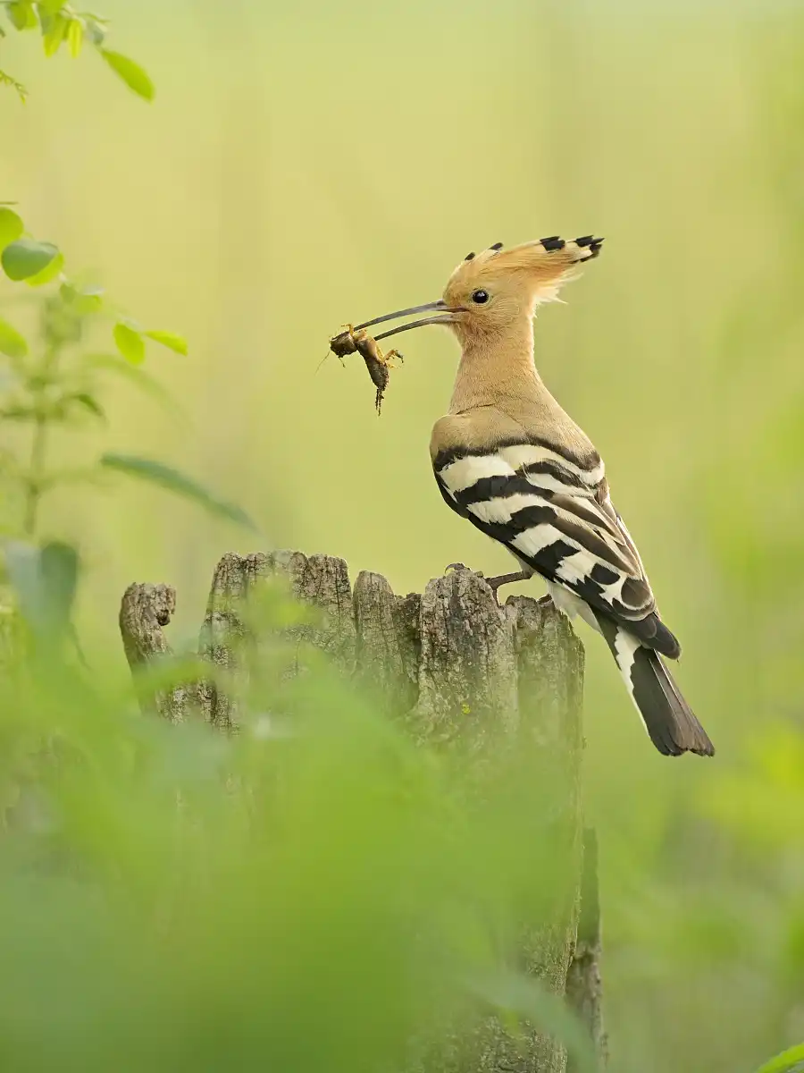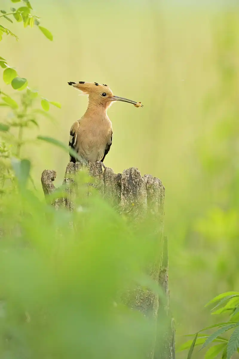 Dudkov na danej lokalite bolo minimálne 10 kusov, ale nevedeli sme nájsť ani len staré hniezdo . Tak sme sa vracali na začiatok, kde sme prvýkrát videli dudka. Znova bol tam. Sadli sme do auta a čakali. Po krátkom čase vidíme dudka letieť do malého zarasteného vinohradu. Po chvíli sa vracal znova hľadať potravu na lúku a my obhliadnuť všetky stromy a dohľadať dutinu. Prešli sme to tam všetko a nikde sme nič nenašli. Vraciame sa k autu a pri ceste sme počuli mladé vtáčatá. Nedalo mi to a cez žihľavu som šiel pomaly za zvukom . Na zemi, v starom pni som ich našiel. Z vrchu boli asi 3 úzke otvory. Myslel som si, že ide o nejaký iný druh. Volám Tomáša, že je tam hniezdo, ale neviem od čoho. Podľa zobákov to vyzerá na dudkov. Neboli sme si istí, tak znova sadáme do auta neďaleko hniezda a čakáme, kto príde nakŕmiť mladé vtáčatá. Po asi 15 minútach prilieta dudok. Sadol len nad hniezdo, do koruny stromu a pozoroval okolie. Až teraz sme určite vedeli vedeli, že to hniezdo je jeho 🙂 Super , našli sme moje prvé dudkové hniezdo na SK .