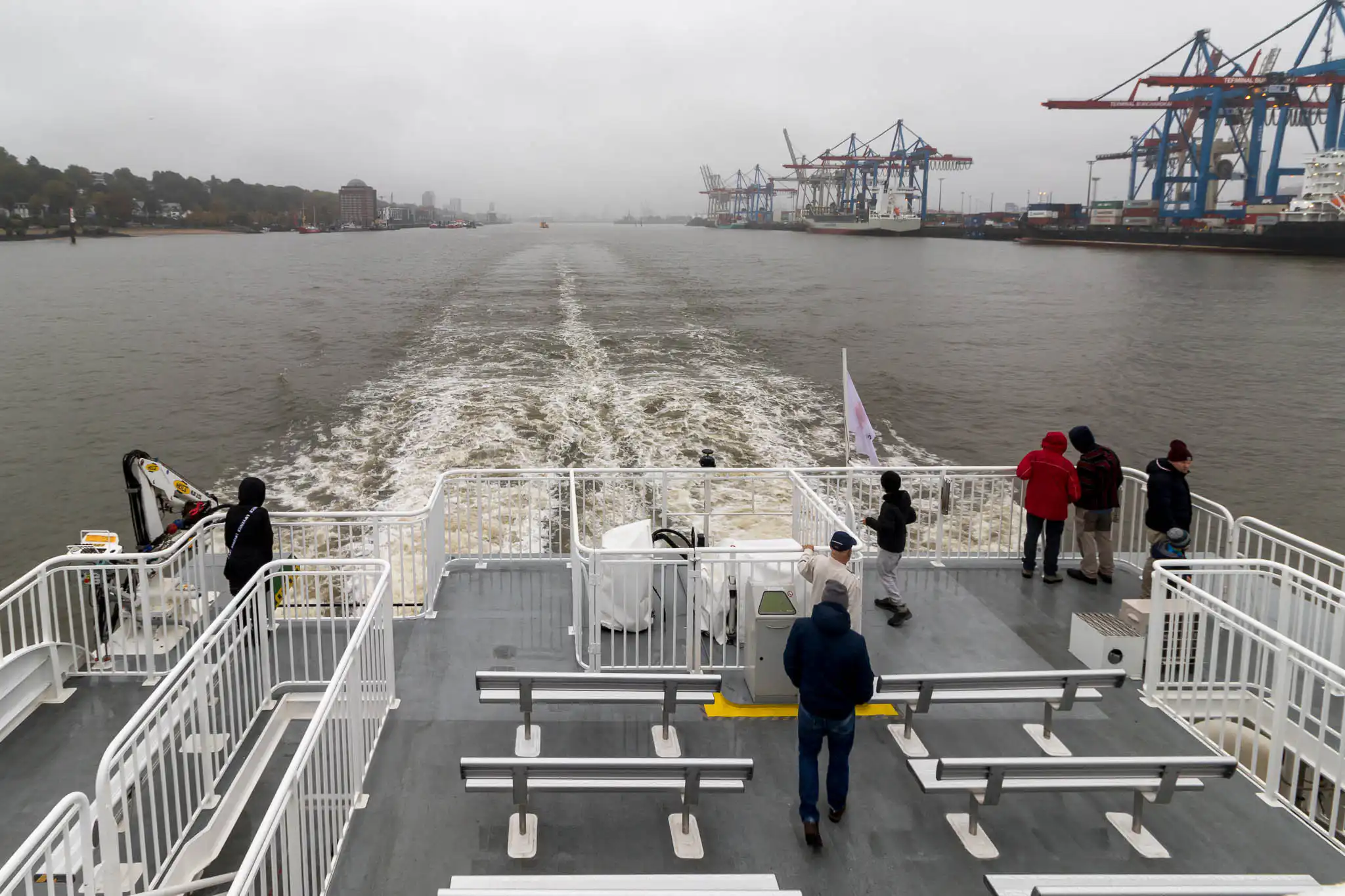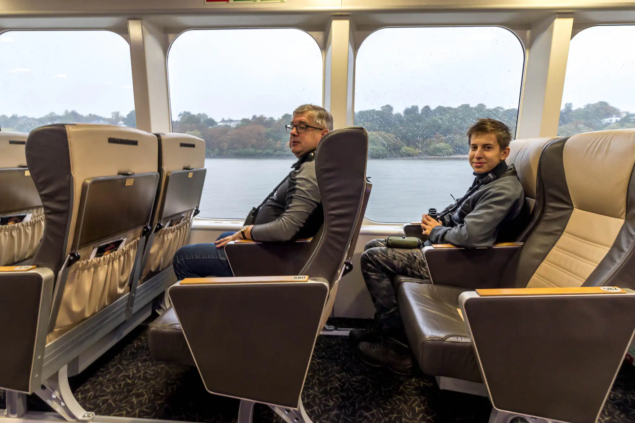Trajekt vyplouvá v 9 hodin. My se hned jdeme podívat na palubu, odkud nás ale brzy vyžene déšť a vítr. Znechuceni zážitkem ve flixbusu si chceme zlepšit náladu dobrým jídlem a tak si objednáváme dobroty z palubního menu. Zejména někteří z nás netuší, že se jim to už brzy má nevyplatit. Protože je trajekt skoro prázdný, využívá Libor šanci a zaujímá nejlepší pozorovací strategii a sedá si k oknu. Už na Labi připisujeme první druhy, Ondra hlásí třeba husu tundrovou a orly mořské. Už v Hamburku samozřejmě vidíme první racky, mezi stříbřitými a chechtavými také prvního mořského. Na vodě plave několik chocholaček, jeden roháč a jak se blížíme k moři, tak i velký zástup bernešek bělolících a pár tmavých. Všímaví kluci vidí i zapomenutou vlaštovku a pět špačků.O nic méně všímavý Libor pak registruje dokonce kosa v příbřežních porostech. Naše ptačí hlídka mezi Hamburkem a přístavem v Cuxhavenu registruje dohromady 23 druhů ptáků.