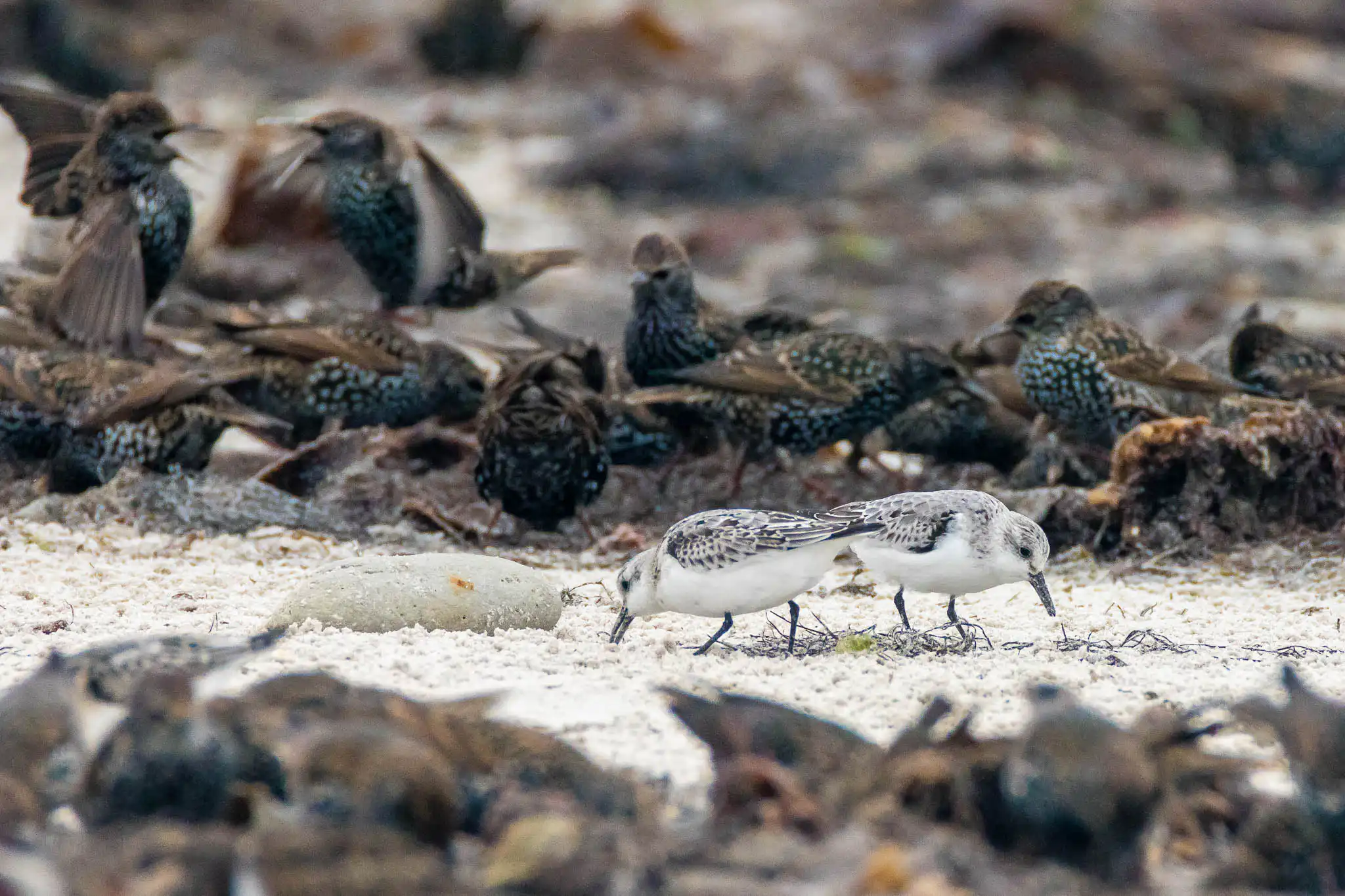 Naše “pobřežní hlídka” končí na Südstrand tam nacházíme obrovské počty ptáků. Je tu asi pětistovka špačků, mezi kterými pobíhá několik desítek bahňáků – kameňáčků, jespáků mořských, písečných a obecných. Znovu se objevují kulíci zlatí a taky trojice břehoušů rudých. Přilétají opět i skřivani ouškatí. Přelétá nám nad hlavami několik bernešek tmavých. Jirka s Ondrou si lehají na pláž a fotí zblízka bahňáky, kteří běhají tak blízko, že to ani objektivy nezvládají. Po chvíli to nevydržím a přidávám se.