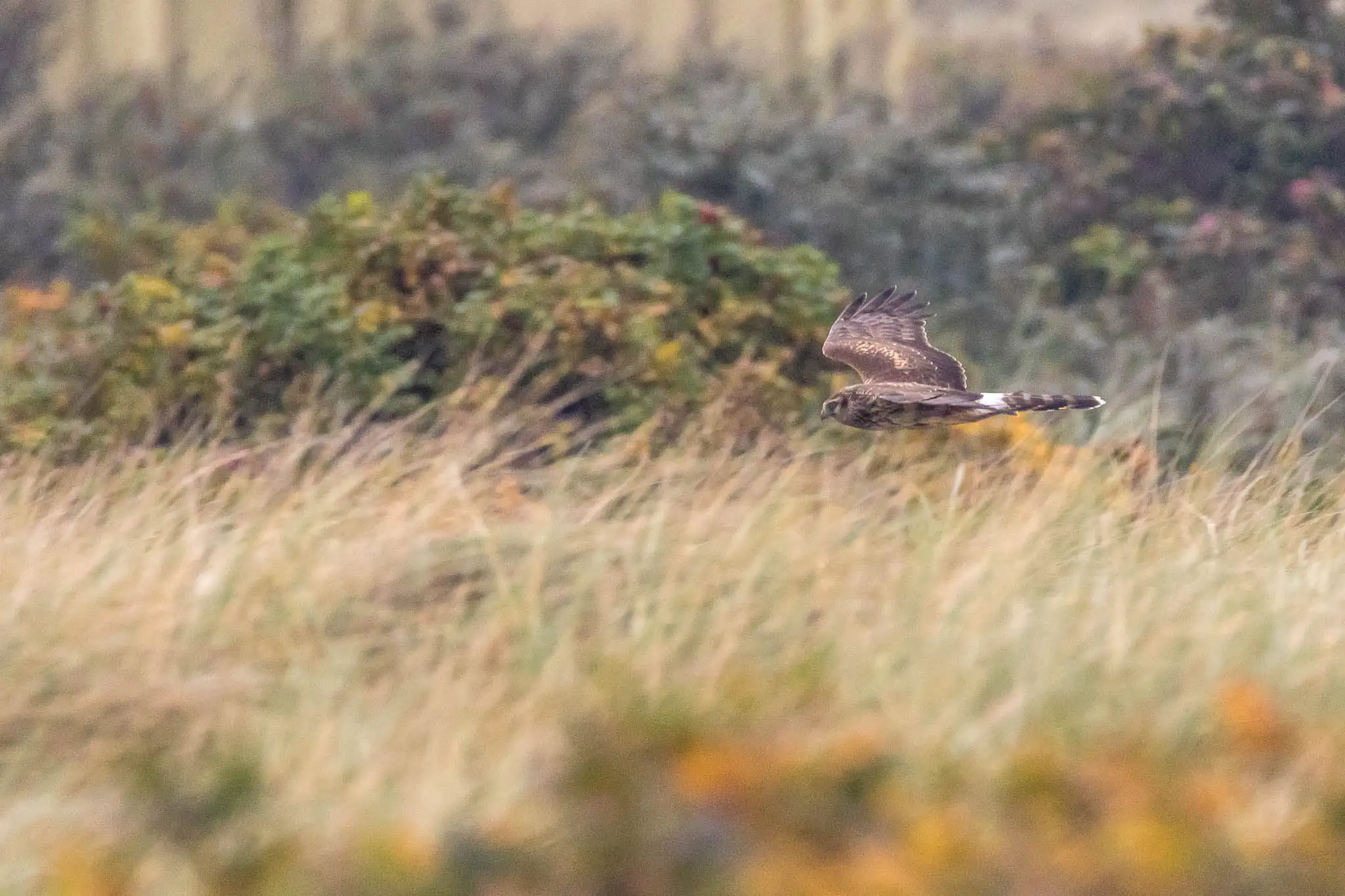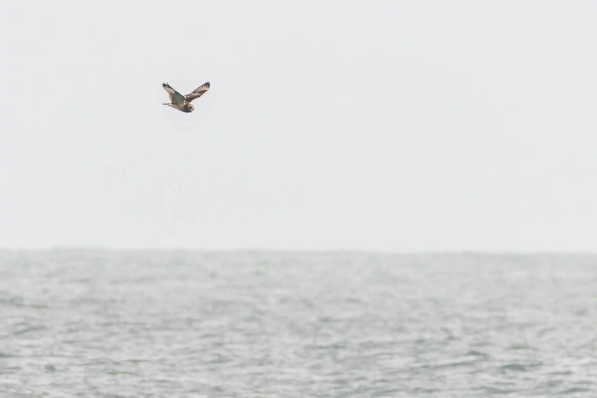 Vracíme se za klukama na Nordstrand. Znovu fotím strnada severního a navíc taky jespáka mořského a kulíka zlatého, kteří se vůbec nebojí. Nad mořem najednou vidíme podivně letícího ptáka. Pomalé rázovité údery křídel prozrazují pustovku.