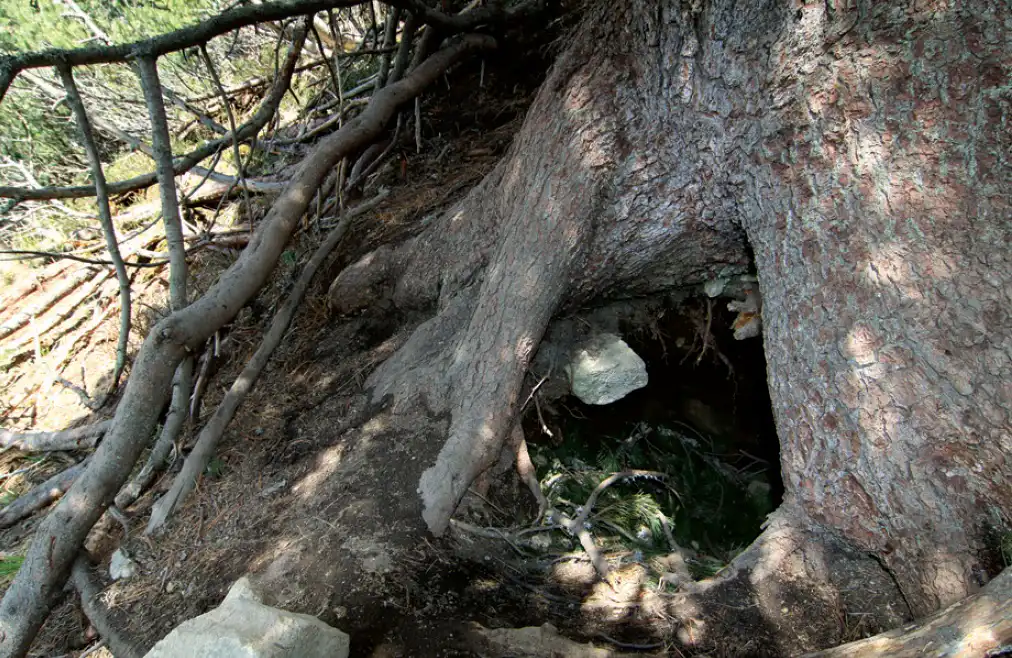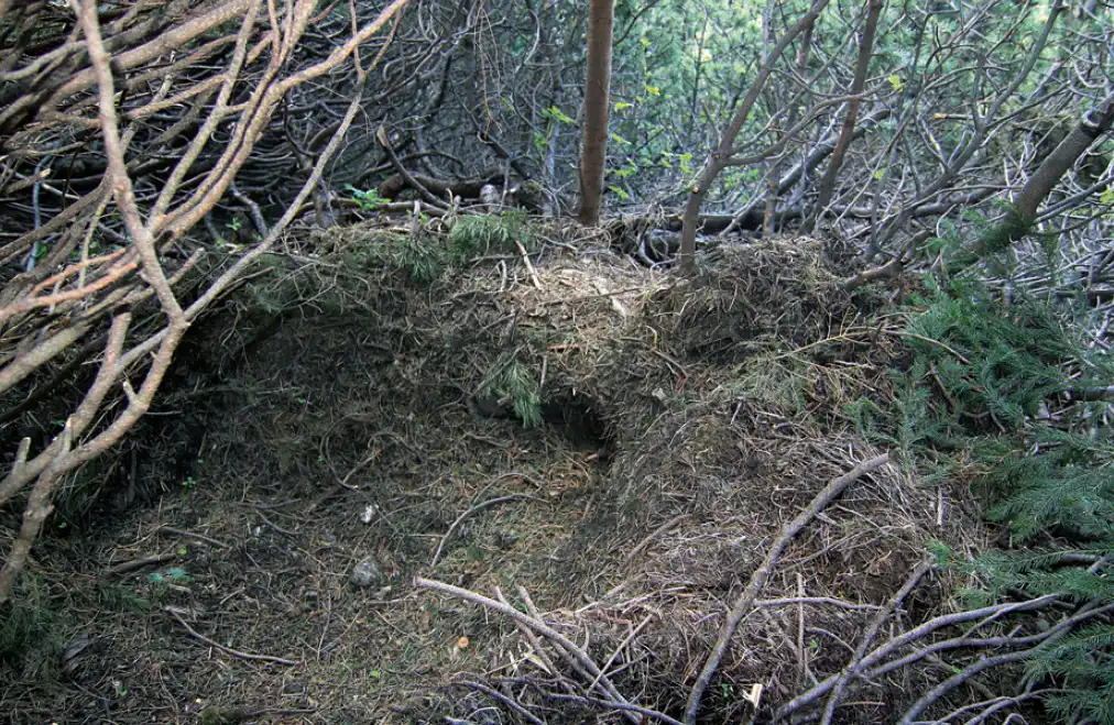 Nejčastějším typem brlohu v tatranské oblasti je brloh na zemi neboli povrchový brloh (obr. 4). Medvěd si ho buduje buď v porostu kosodřeviny, nebo na příhodném místě na horní hranici lesa. Ve druhém případě ho často zakládá pod výrazně zavětveným jehličnanem, většinou smrkem. Aktivní plochu brlohu (lože) tvoří výstelka z větví, suché trávy, mechu, jehličí a materiálu, který je poblíž. Vrstva je silná většinou okolo půl metru. Lože má kruhovitý tvar a průměr okolo metru. V tomto tzv. standardním povrchovém brlohu medvěd leží v poloze, aby byl z boků dostatečně překryt výstelkou. Někdy mu k ulehnutí k zimnímu spánku postačí i brloh vyhrabaný v terénu, který zajistí nadúrovňovou ochranu. V povrchovém brlohu medvěda shora chrání buď silně zavětvený smrk, nebo dostatečně dlouhé větve kosodřeviny. Ty společně s napadaným sněhem vytvoří horní izolační vrstvu brlohu. Charakter brlohu se někdy odvíjí i od toho, zda v něm bude zimovat samec, nebo plná samice. Obecně platí, že plné a vodící medvědice využívají komfortnější brlohy. V blízkosti každého brlohu vede buď jeden, nebo i více medvědích chodníků. Ostatní pobytová znamení v podobě oloupaných či ohryzaných stromů v okolí mohou být velmi výrazná, ale mohou též zcela chybět. Při troše štěstí lze v brlohu nebo v jeho blízkosti najít „zátku“, což je vlastně první trus po hibernaci (obr. 5).