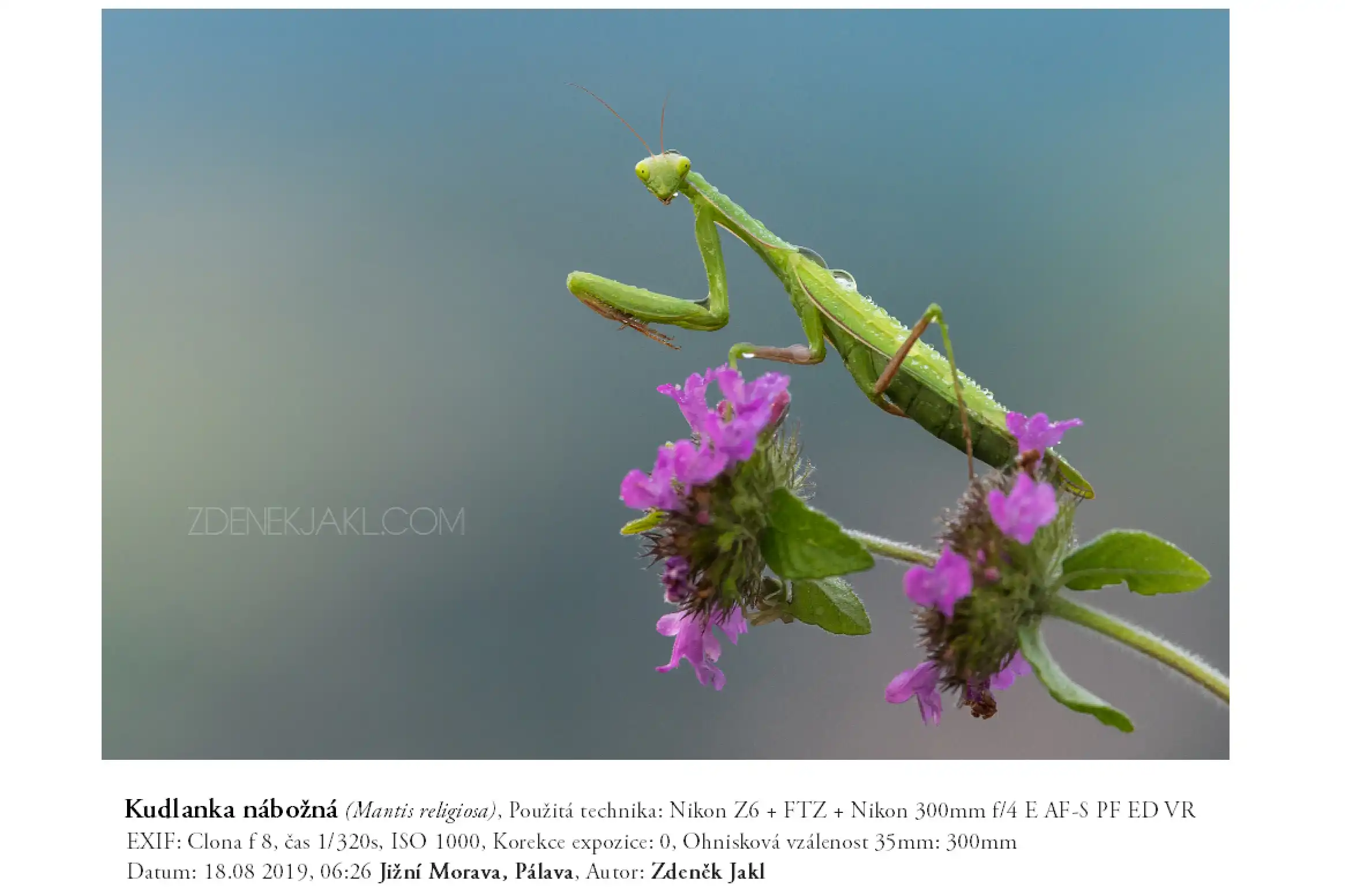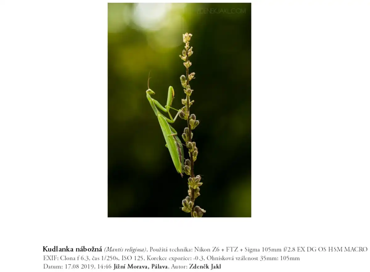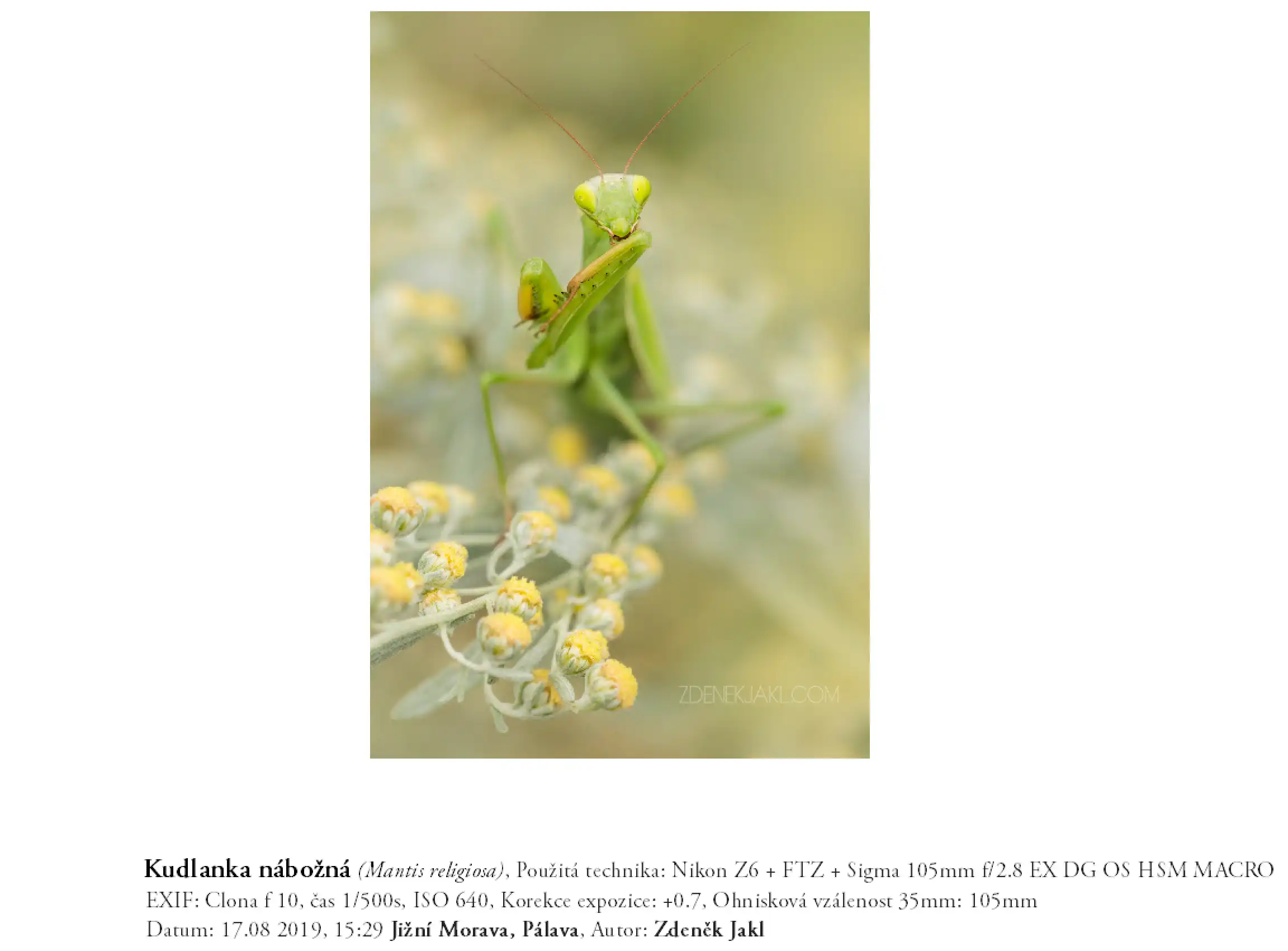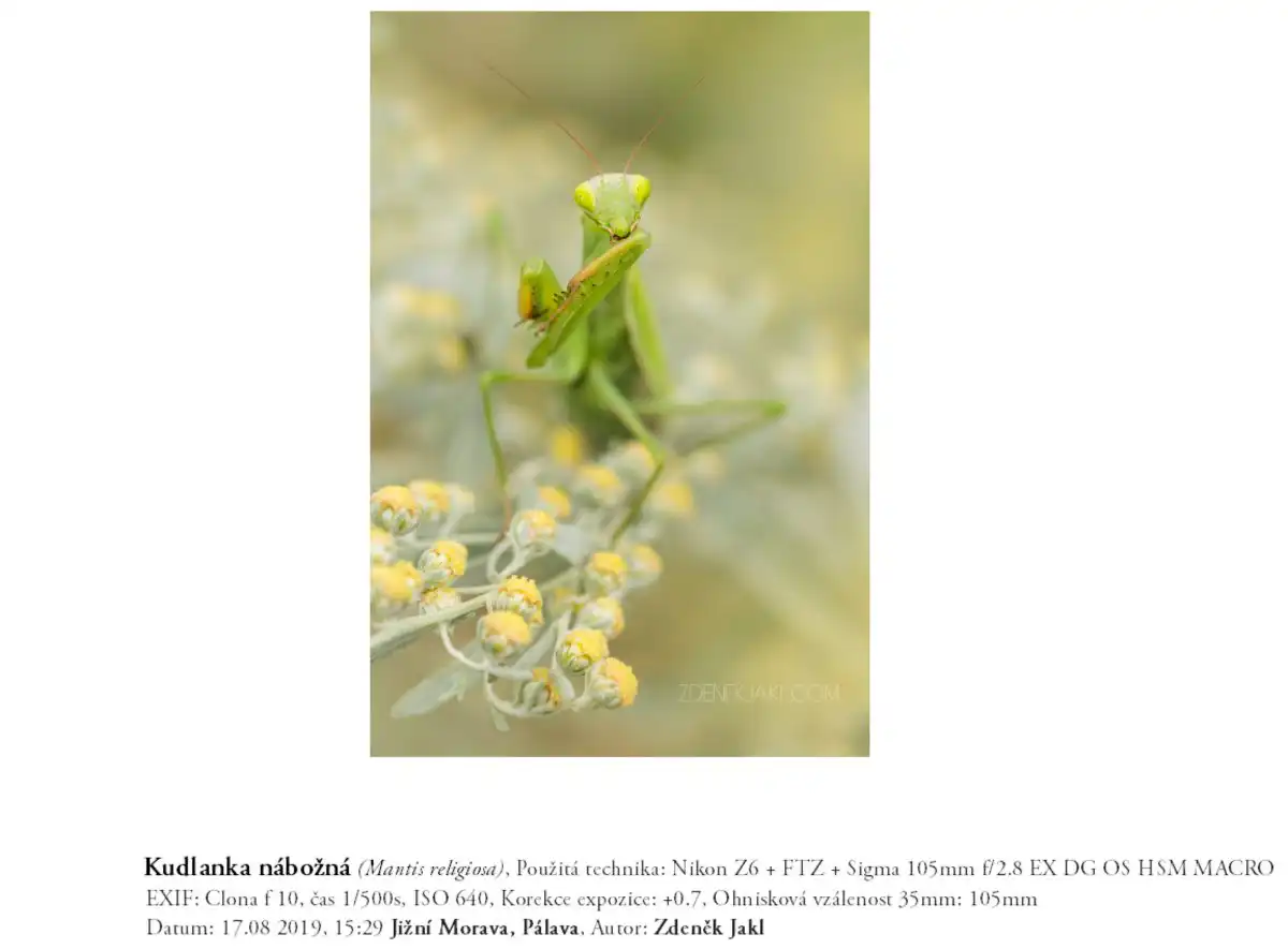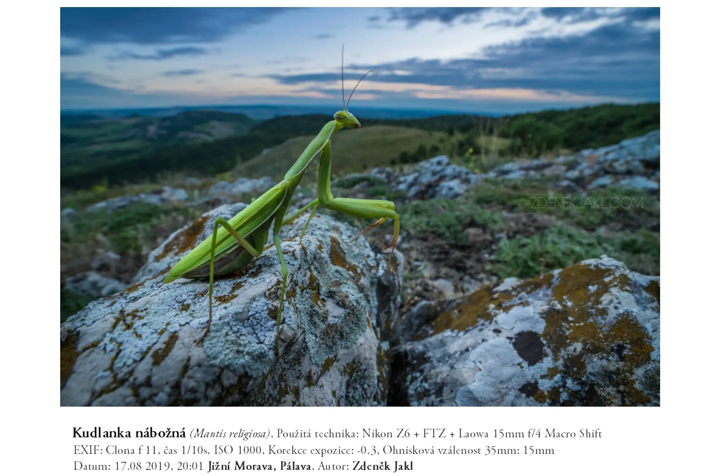 V srpnu jsme se s kamarádem Honzou rozhodli vypravit na osvědčené místo v oblasti Pálavy, kde jsme kudlanky fotili už minulý rok. Je zajímavé, že na daném místě se kudlanky vyskytují dle naší zkušenosti pouze na několika desítkách čtverečných metrů, ačkoliv rozloha vhodného místa pro jejich výskyt je mnohem větší. Tato zkušenost se letos opět potvrdila a kudlanky jsme našli přesně na stejném místě jako minulý rok. Díky chladnějšímu roku ve srovnámi s rokem minulým byly tyto šelmy hmyzí říše méně narostlé a co především – jejich počet nebyl zdaleka tak vysoký jako loni. Tehdy se nám podařilo najít jednu téměř na každém suchém stéblu v obou barevných variantách – hnědé nebo zelené. Tento rok Pálava tak štědrá nebyla a první kudlanku jsem našel velmi dobře maskovanou na spodní straně květu po zhruba půlhodině hledání a zůstala až do večera také jedinou. Za víkendové focení jsme našli nakonec 3 samičky kudlanek, což v porovnání se zhruba 10 až 12-ti kusy nalezených během chvíle v roce minulém nebyla žádná sláva. Každopádně jsme tentokrát byli lépe vybaveni a ke slovu přišla především nová bezzrcadlovka Nikon Z6, kterou jsem si před focením kudlanek čerstvě zakoupil a došlo i na focení „makroširokáčem“ Laowa 15mm f/4 Macro Shift, který jsem si obzvláště oblíbil pro jeho specifické optické vlastnosti. Kombinace Nikonu Z6 a výše uvedené Laowy je opravdu dokonalá. (V případě zájmu o bližší informace neváhejte napsat zprávu přes kontaktní formulář).