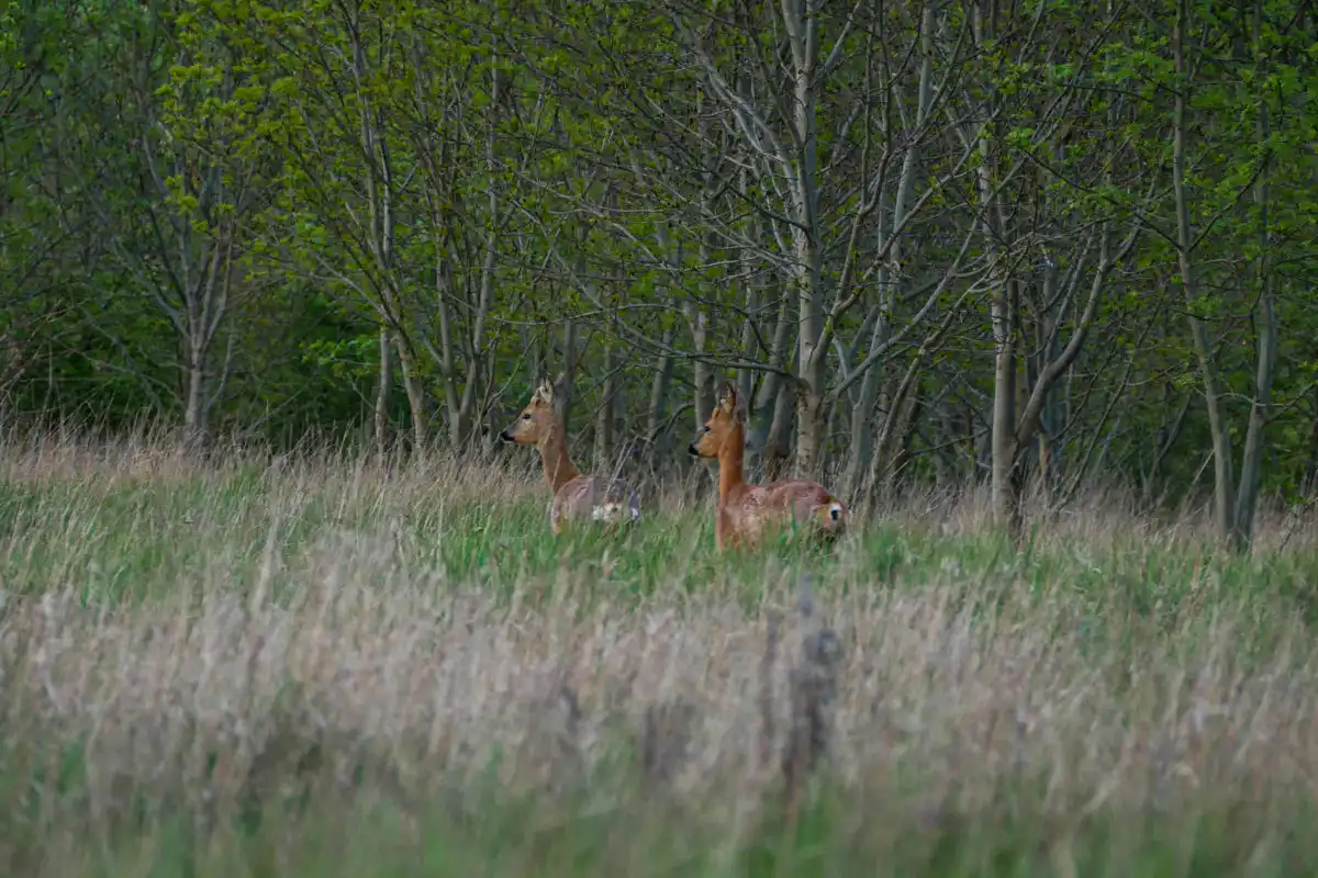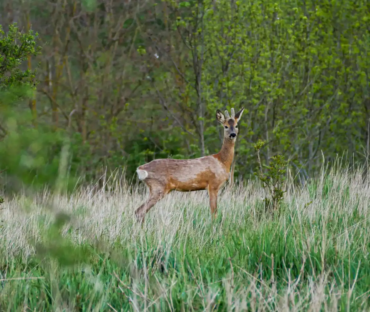 Bol pomerne teplý máj a preto som sa rozhodol ísť fotiť skoro ráno aby som sa vyhol horúčavám a ráno je zver oveľa viac aktívna. Vstal som okolo piatej, sadol som na bicykel o o pol šiestej som už bol na mieste. Prechádzal som cez húštiny aby som sa dostal k starému nepoužívanému posedu ktorý mi poslúži ako pozorovatelňa. Po ceste som natrafil na zajaca poľného. ktorého sa mi žiaľ nepodarilo odfotiť. Posed som bohužiaľ našiel zvalený ale v jeho ruinách som foťákom “ulovil” malého ježka. Potom som si ľahol na zem a zakryl sa maskovaciou sieťou. Asi po desiatich minútach vyšla srna s mladým minuloročným srncom. Sledoval som ich asi päť minút ale boli pomerne ďaleko. Zrazu z kríkov vyšiel asi dvojročný srnec, pekne sa mi postavil pred fotopušku.