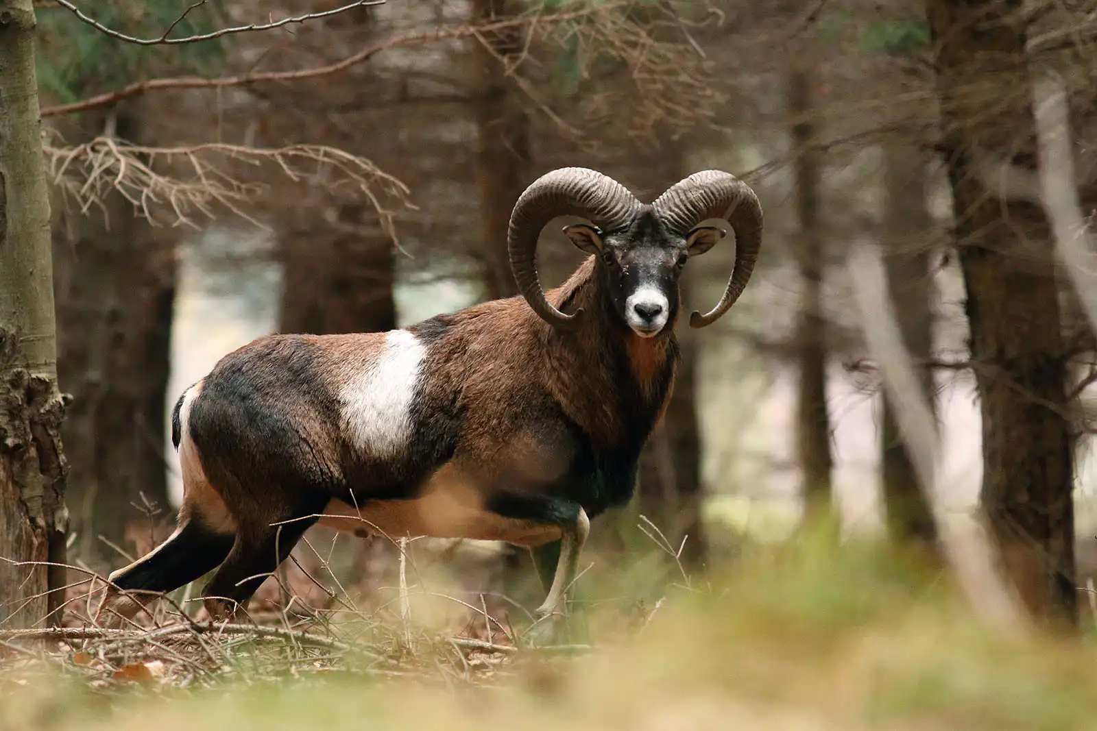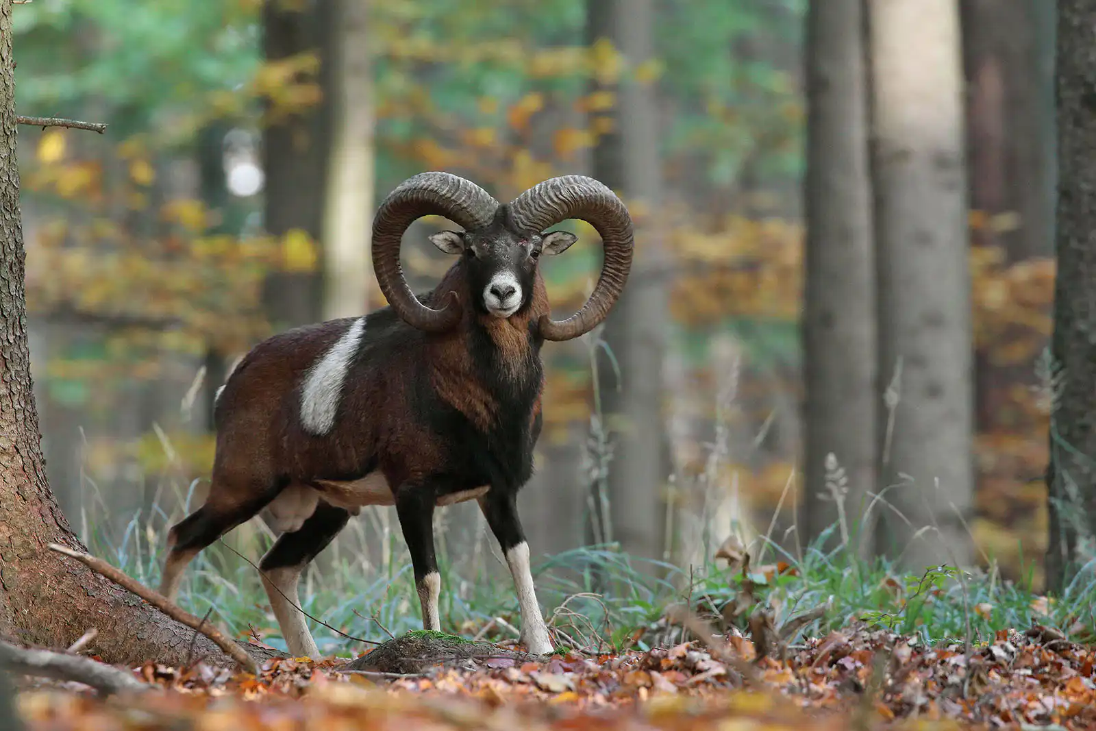 Mám hodně různých pěkných setkání. Sedím si tak ve skupince mladého smrčí, dole pod větvemi je tak metr a půl relativně průhledno a čekám co půjde okolo. Často je lepší čekat, než je aktivně vyhledávat, s neustále šustícím listí je to téměř nereálné. Zahlédnu kdesi vpředu pohyb, jen ještě nevím, co to je. Daněk? Muflon? “B” je správně. A jsou dokonce dva, slušní kousci s pěknýma rohama. A míří si to přímo mým směrem a já jsem připraven. Pořizuji pár fotek, jsou blízko a to je protentokrát velký problém. Mám totiž pevnou čtyřstovku! Co když přijdou blíž? Taky, že jo. Už musím fotit na výšku, aby se celí vešli. Jednou dvakrát se na chvíli zastavili, aby si prohlédli to něco pod smrčkem, ale pak pokračují okolo, ještě jednou se na chvíli zastaví a zkontrolují mě, pak zalezou dál do smrčků a zalehnou. Chvíli jsem přemýšlel, jak z toho ven, abych je zbytečně nevyplašil, až půjdu jinam, ale jinak se nedalo.