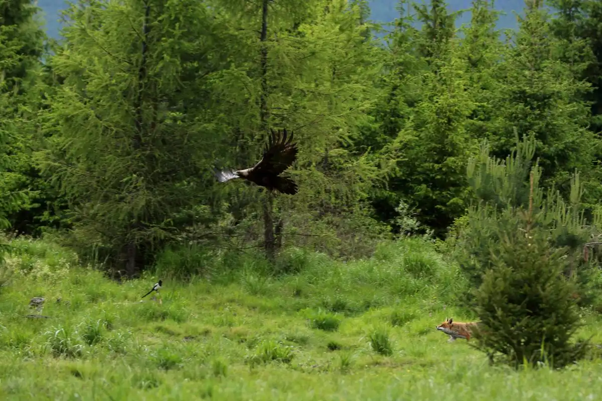 Tento príbeh mám stále pred očami. Mal som šťastie a zažil moment ktorý sa v prírode často neopakuje. Pri čakaní na medveďa cez medvediu ruju som v diaľke videl líšku ako prechádza pomedzi stromčeky. Z oblohy niečo zletelo na zem, vôbec som nespozoroval čo to bolo. A vtedy začala bitka. Všetko sa to odohrávalo na okraji lesa a bolo to dosť ďaleko. Až podľa pískania som dokázal identifikovať že to bol Orol Skalný. Vtedy líška pozbierala všetky sily a ubránila útok orla. Celý priebeh som sa snažil zachytiť fotoaparátom no nedarilo sa mi zaostriť na klbko orla a líšky. Pripravený som čakal čo bude nasledovať. To že líška vyženie orla a asi tri krát za nim vyskočí v snahe chytiť ho. O tom sa nám fotografom iba sníva. No teraz to bola realita. Líške sa orla nepodarilo chytiť a za pár sekúnd bolo v lese ticho akoby sa vôbec nič nestalo.