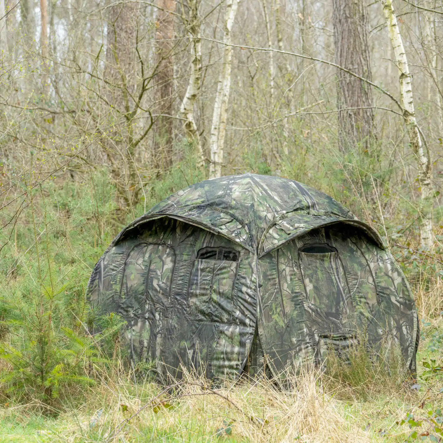 Priestranný vchod má kvalitný zips, po otvorení zostáva pekne pri boku a je vybavený aj sieťkou proti hmyzu v rovnakom maskovacom vzore. Stan tak zostáva dokonale maskovaný aj pri mierne otvorených dverách.