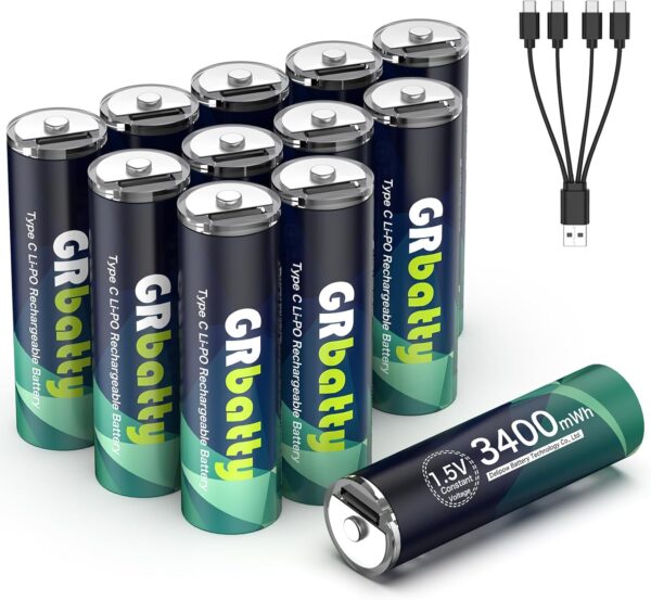 Super výkonné GRbatty Lithium – lítiové AA batérie s kapacitou 3400 mWh. Nabíjajte ich kdekoľvek pomocou integrovaného USB-C portu. Ponúkajú stabilné napätie 1,5 V a výdrž až 1500 nabíjacích cyklov. (Balenie 12 ks + 1xUSB-C kábel)