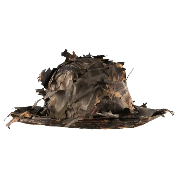 Povrch klobúka je pokrytý precízne vyrezávaným umelým lístím, ktoré vytvára prirodzený trojrozmerný efekt a hĺbku. Pre maximálnu praktickosť v teréne je klobúk vybavený nastaviteľnou podbradnou šnúrkou s plastovou posuvkou, ktorá ho udrží bezpečne na hlave aj v silnejšom vetre alebo pri rýchlom pohybe v hustom podraste.