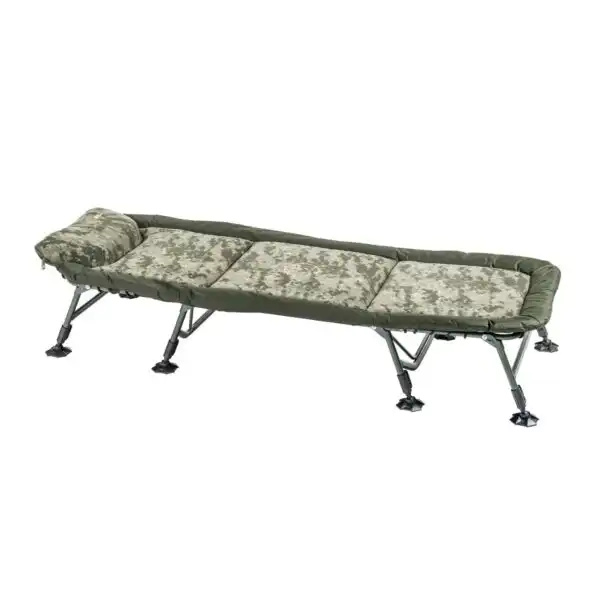 Lehátko radu Flat v exkluzívnom digitálnom maskovaní CamoCODE je navrhnuté pre náročných kaprárov, ktorí preferujú 100% plochý profil bez rušivých kĺbov. Vďaka robustnej konštrukcii s priemerom rúrok 2,5 cm je lehátko mimoriadne pevné, no vďaka použitým materiálom si zachováva prekvapivo nízku transportnú hmotnosť.