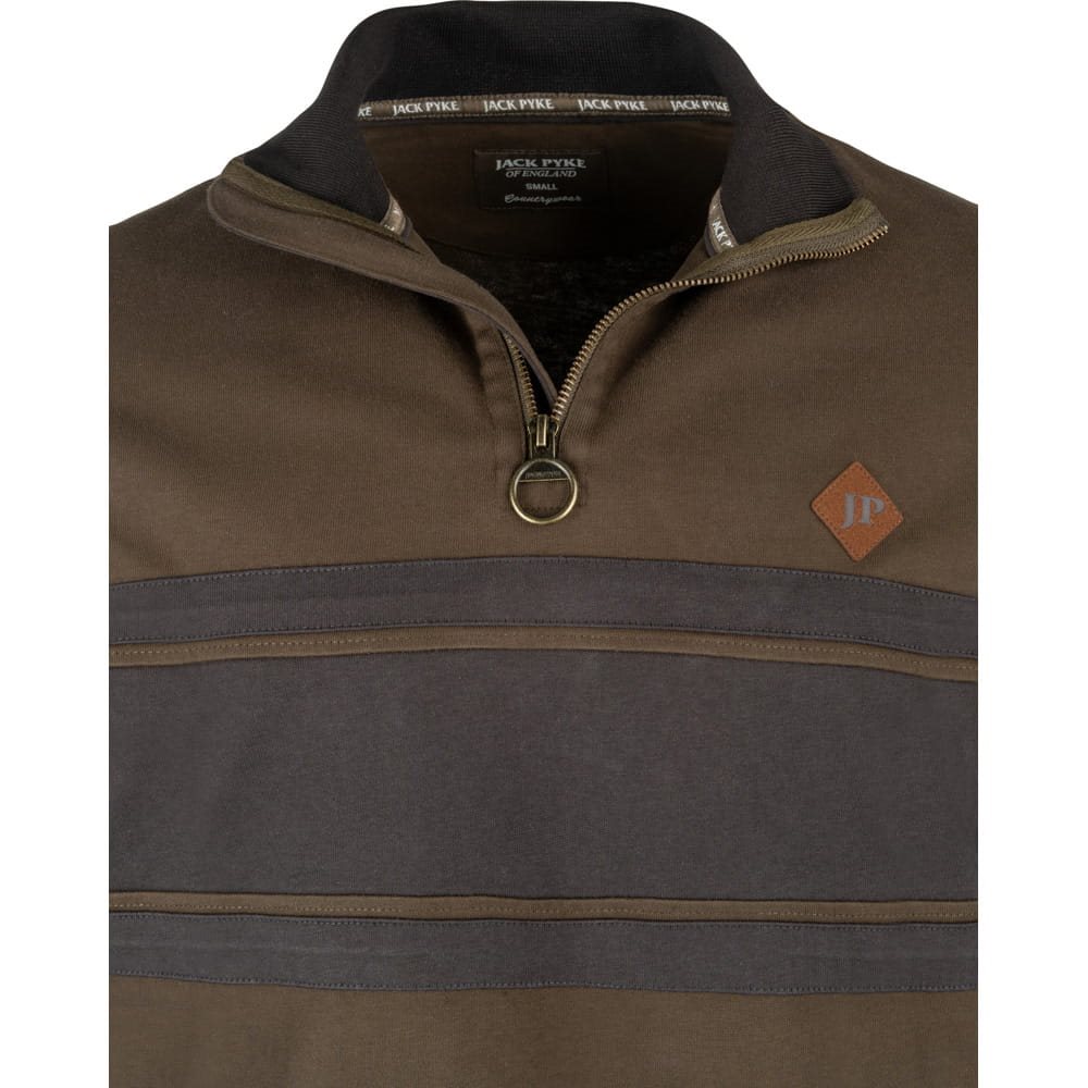 Výrazným prvkom je zvýšený stojačikový golier, ktorý spoľahlivo chráni krk pred chladom. Zapínanie je riešené štýlovým kovovým zipsom, ktorý je doplnený praktickým tiahlom v tvare kovového krúžku pre jednoduchú manipuláciu. Kontrastné panely na hrudi a rukávoch opticky tvarujú postavu a dodávajú mikine moderný šmrnc, ktorý dopĺňa subtílne logo Jack Pyke na hrudníku. Elastické náplety na manžetách rukávov zabezpečujú, že mikina perfektne sedí a neprepúšťa teplo.