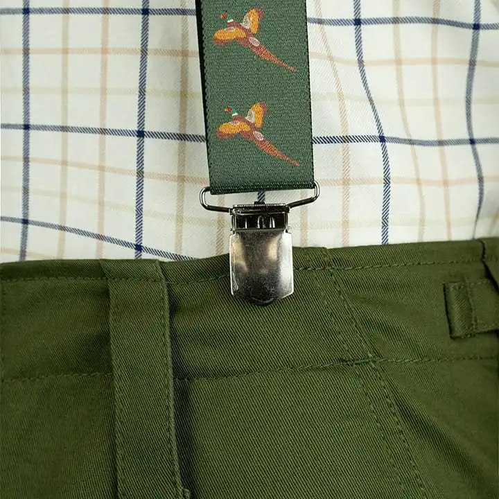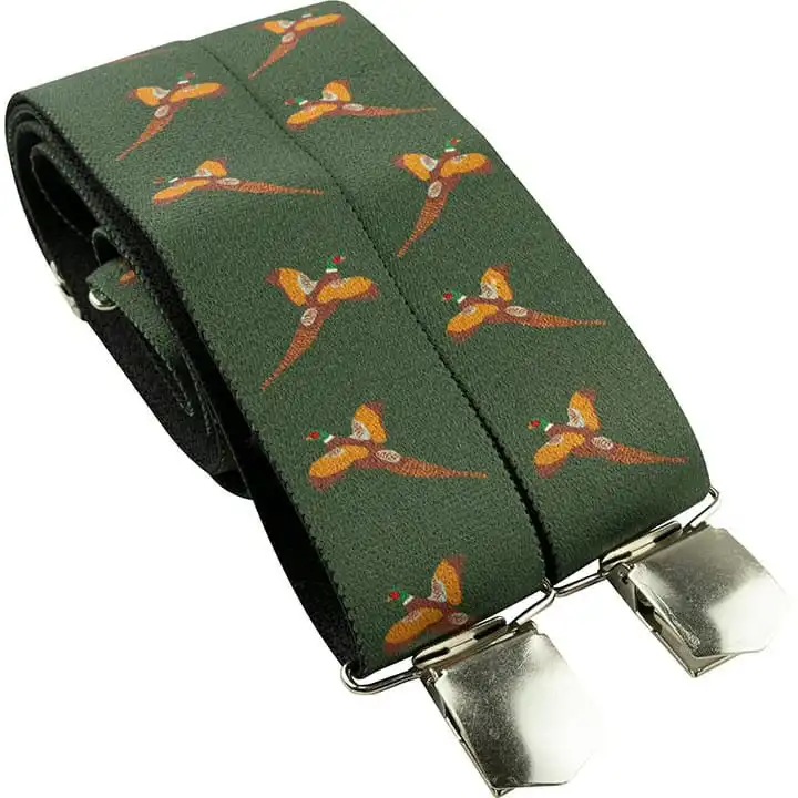 Originálne prevedenie s potlačou bažantov je doplnené o vkusné detaily z pravej kože, ktoré dodávajú produktu punc kvality a luxusu. O stabilitu sa starajú štyri robustné kovové klipy so silným stiskom, ktoré sa dajú jednoducho pripevniť na akýkoľvek typ poľovníckych či voľnočasových nohavíc. Nastaviteľná dĺžka v rozmedzí 70 až 115 cm zaručuje, že traky padnú postave každej výšky.