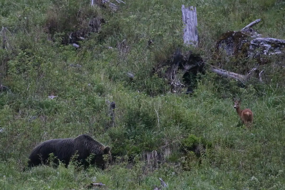 kilometrov. Dlho som veril aj akémusi nepísanému pravidlu, že keď niekde čakám na srnca a prvý príde medveď, srnec sa viac neukáže. Iba vďaka trpezlivosti bez nároku na úspech som pochopil, že toto v horách neplatí vždy. V prostredí, kde je srnčej zveri málo, sa tieto dva druhy do veľkej miery tolerujú. Neraz som pozoroval, ako sa medveď a srnčia zver spoločne pásli na jednej lúke. Dokonca niekedy sa dostali k sebe na vzdialenosť, ktorá sa medveďovi ponúkala sama. Keď medveďovi chýbal už iba nejaký ten krok alebo dva… a nestalo sa nič. Ako sa k sebe priblížili, rovnako sa od seba vzdialili. Dokonca ani vlci tu počas leta o ňu neprejavujú až taký záujem, ako sa to z času na čas prezentuje. Vzácne sa srnčia zver vyskytuje v prostredí, ktoré je domovom kamzíkom. Nikdy tu ale neobsadzuje skalné prostredie – také typické pre kamzíky. Jej tu vyhovujú