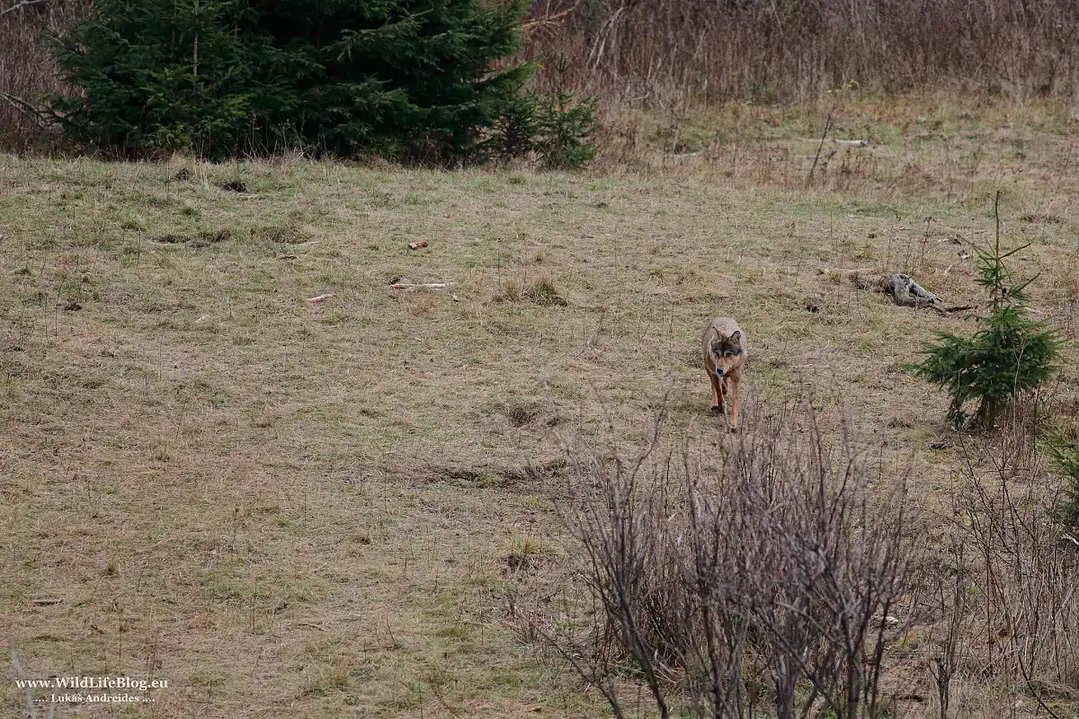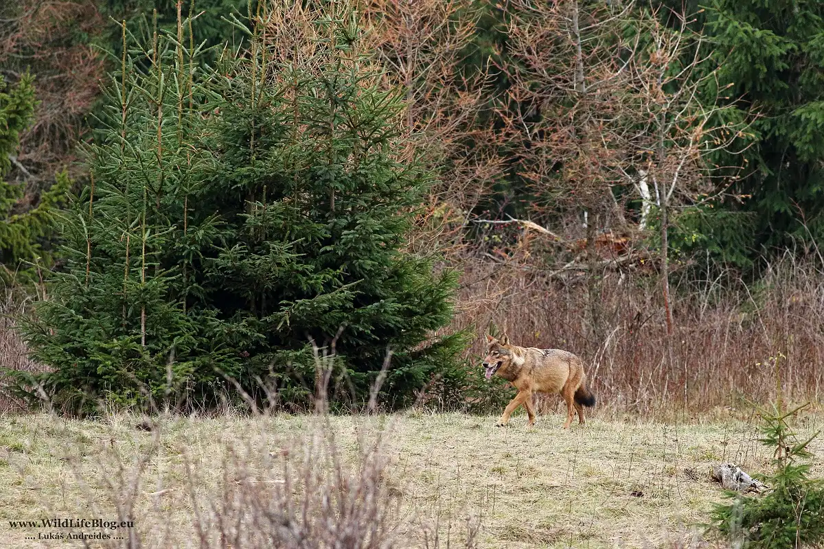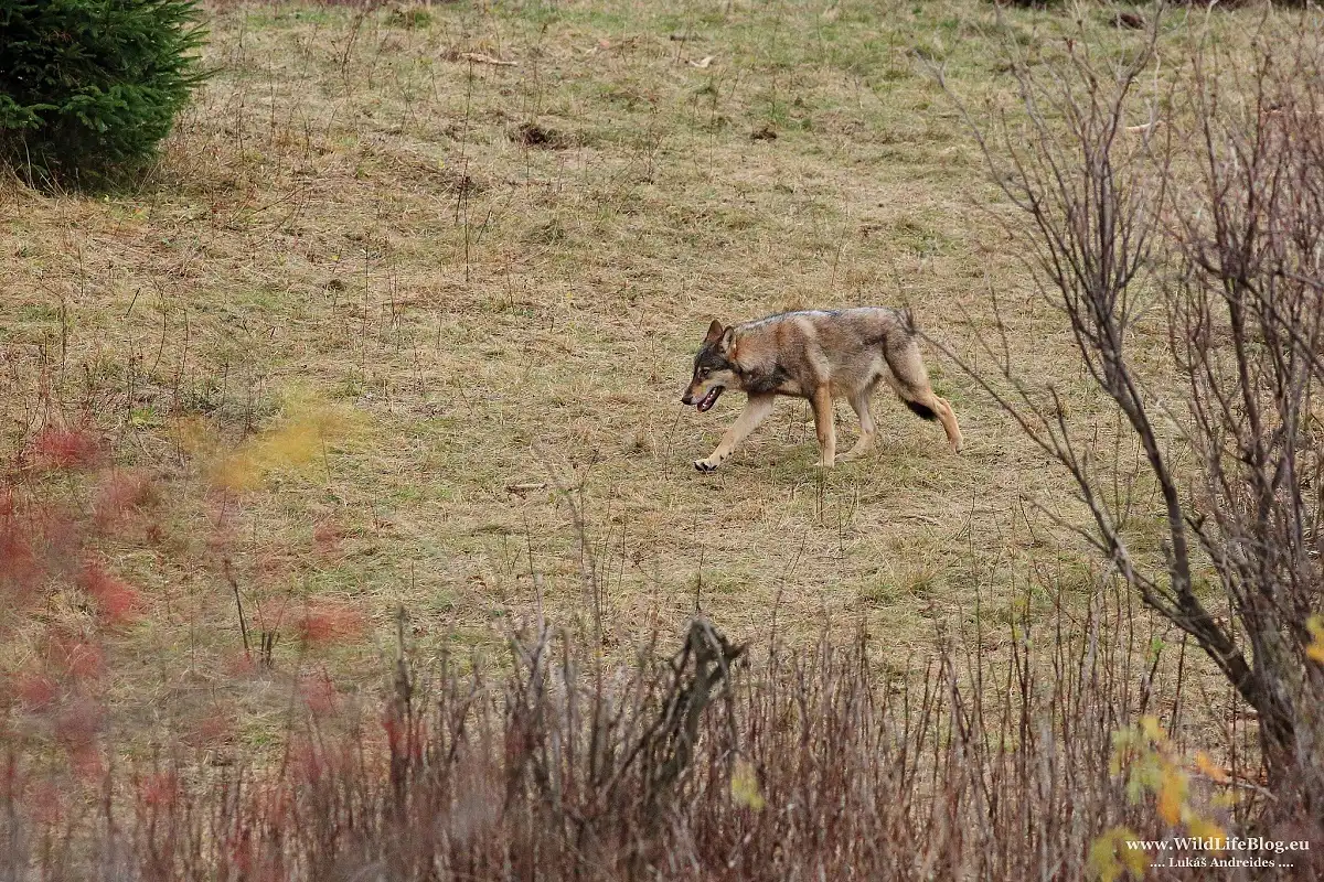 A oni prišli tak ako prvý krát. Prvá išla vlčica, bola nesmierne opatrná. Rýchlo prebehla cez otvorené (nezarastené) miesto kde som ich čakal. Podarilo sa mi urobiť zopár fotografií a v napätí čakám že pôjdu aj ostaní dvaja.