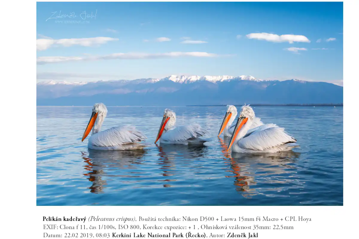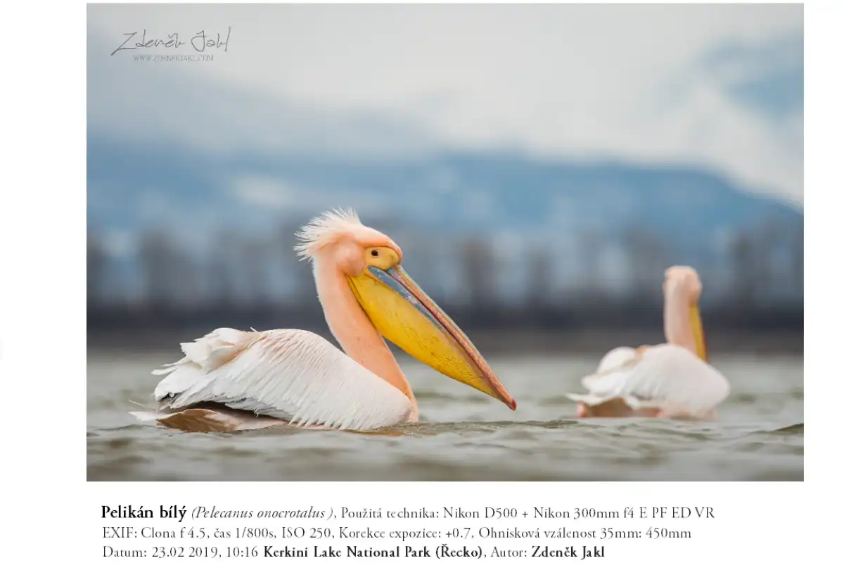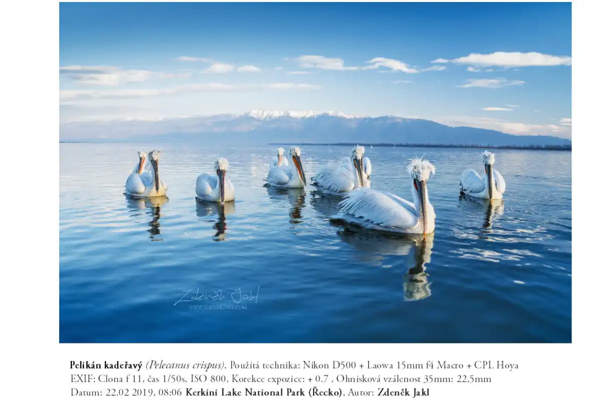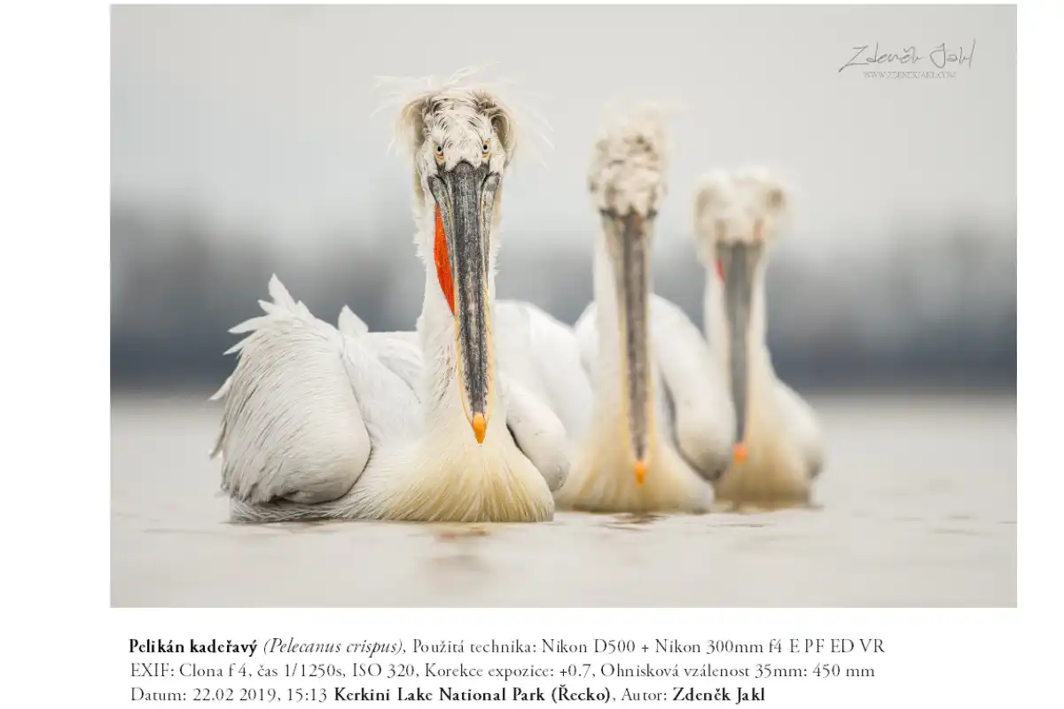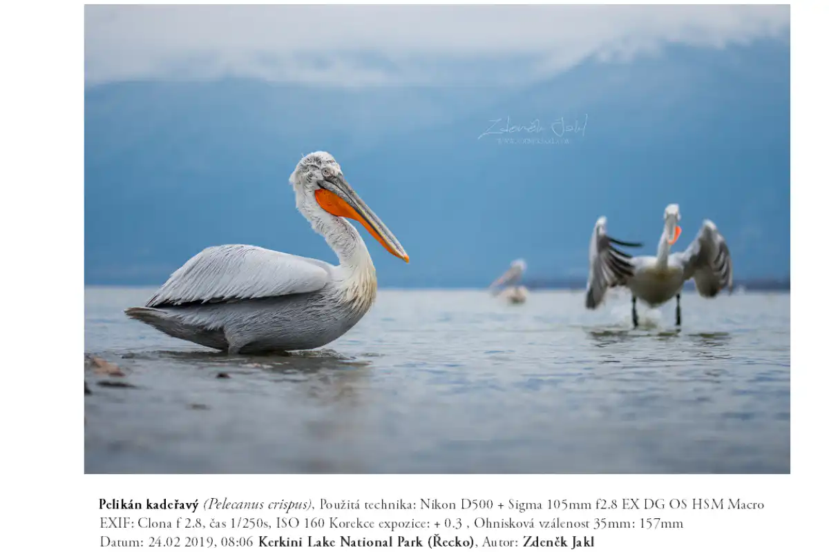 Pelikán kadeřavý patří k největším druhům pelikánů na světě a dorůstá velikosti 140 až 170 centimetrů s rozpětím křídem okolo tří metrů. S váhou přes 10 kilogramů je jasné, že nejde o žádného drobka a jeho hlavní potravu tvoří ryby. V době páření se pelikánům hrdelní vak zbarví do sytě oranžové až červené barvy a to je přesně ten moment, který jsme chtěli v měsíci únoru vystihnout. Na jezeře Kerkini se vyskytuje více druhů pelikánů, ale v zimních měsících je zde nejčastější setkání právě s pelikánem kadeřavým. Při troše štěstí lze zahlédnout i pelikána bílého, který je ve skutečnosti v době páření růžový. Hrdelní vak má sytě žlutý a na horní části zobáku se táhne modrá linie. V době naší návštěvy jezera bylo, dle slov našeho průvodce Nikolaose, na jezeře 7 jedinců pelikánů bílých. Přesto se nám povedlo se dvěmi jedinci setkat jednoho mlhavého rána.