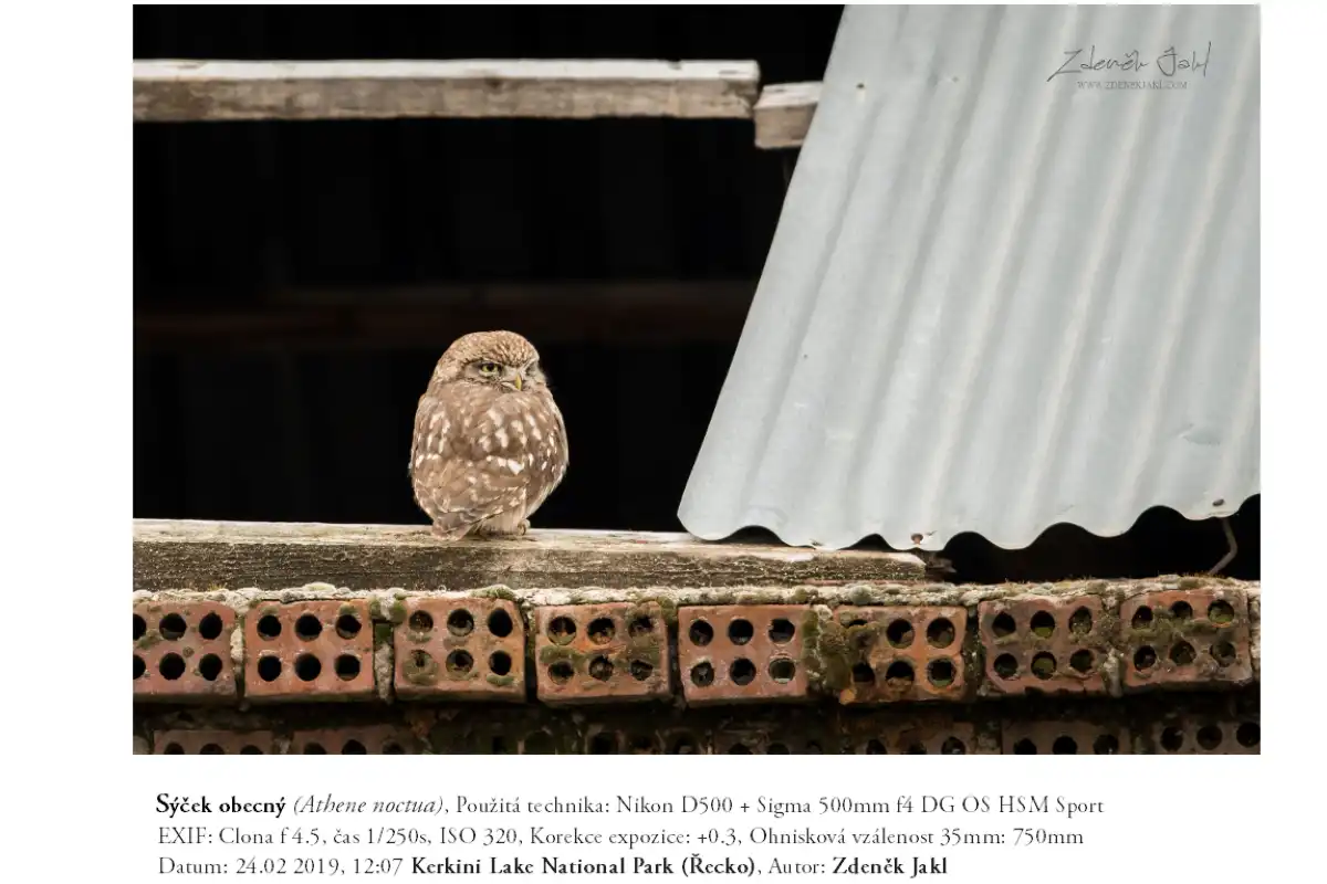 Našeho průvodce Nikolaose jsem hned první den poprosil o tipy na místa pro focení sýčků obecných – mým druhým cílem cesty na Kerkini. O sýčcích jsem mlel stále dokola až mi Vláďa jednoho rána řekl, „hlavně nesýčkuj“ a už se to tak nějak ujalo:-). Sýčkovali jsme pak ale všichni. Díky Nikolaosovi se nám podařilo zahlédnout sýčka na klimatizaci jedné budovy, ale pořád to nebylo na focení podle mých představ. Denně jsme procházeli také část obce nacházející se kousek od jezera, kde měl být velký výskyt těchto krásných soviček a “Nik” nám ukázal i dvě místa s výskytem sovy pálené. Ta se však na rozdíl od sýčka během denního světla téměř neukazuje a tak jsem si tyto staré opuštěné domy uložil do navigace pro případnou další návštěvu. Celé tři dny se nám tedy „sýčkovat“ nedařilo a zadařilo se až při odjezdu na letiště, kdy kousek od hotelu Jirka, sedící za volantem, zahlédl tohoto roztomilého fešáka sedícího na zídce pod krovem staré stodoly.